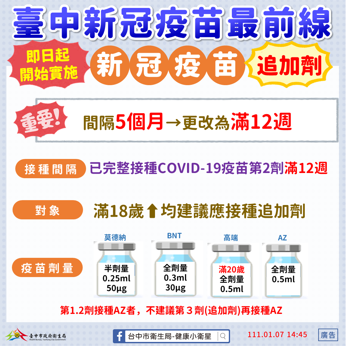 因應新冠疫情嚴峻,中央流行疫情指揮中心今(7)日宣布,新冠疫苗追加劑(第三劑)縮短為只要18歲以上與第二劑間隔滿12周(84天)以上均建議接種,台中市估算於1月31日前符合接種資格民眾近90萬人,因應龐大接種需求,台中市衛生所及合約醫院於這週末均加開門診因應,鼓勵民眾踴躍接種。開診資訊請查詢衛生局官網( https://www.health.taichung.gov.tw/1814719/Nodelist )。