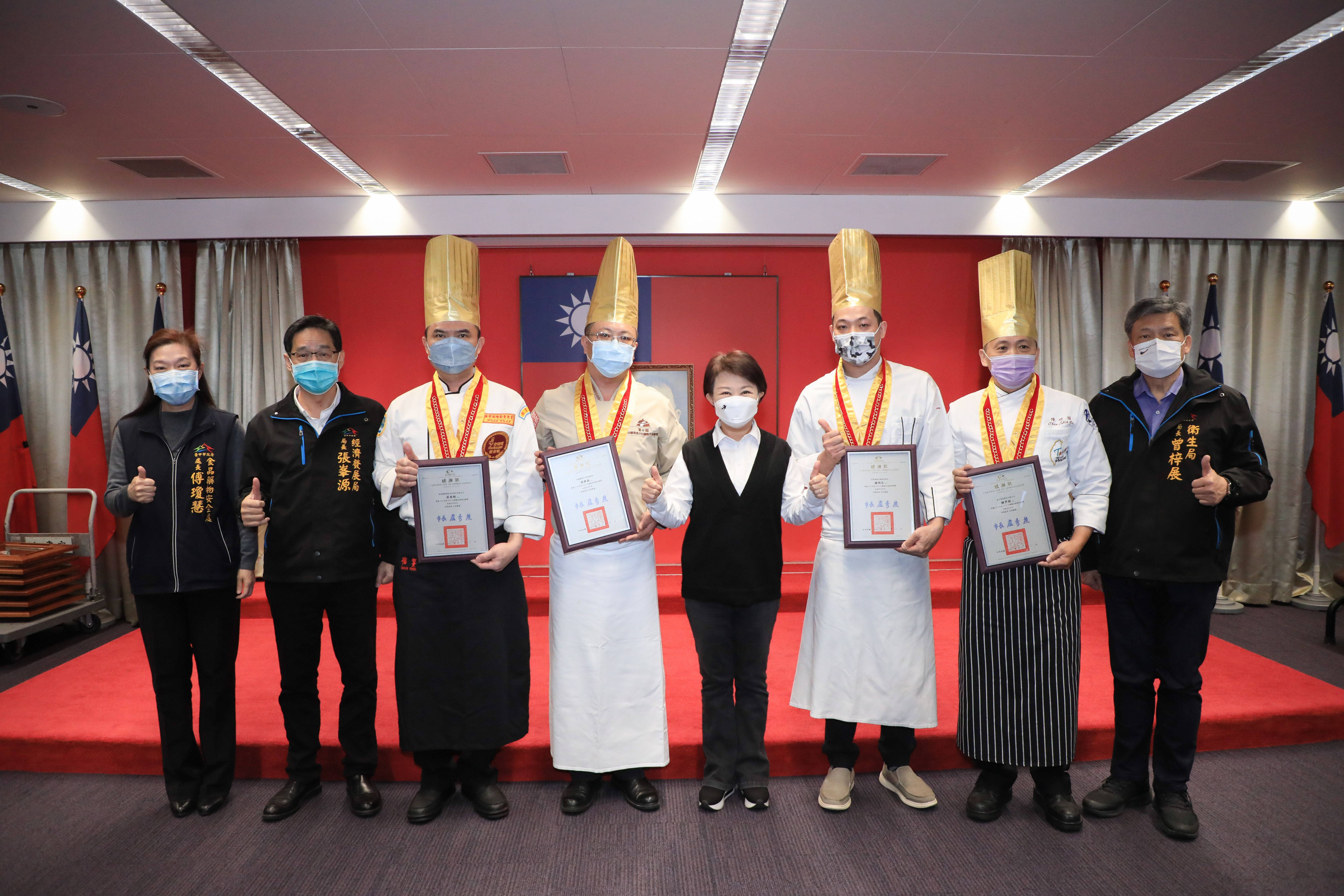 110年全國優良廚師及新秀廚師選拔,台中市4名廚師榮獲金帽獎殊榮,包括福宴國際創意美食公司廚務總監蔡育明、中國醫藥大學附設醫院主廚張啟晸、新洋餐飲公司行政副主廚陳世頡、永豐棧酒店資深副主廚陳明宏。市長盧秀燕今(11)日於市政會議頒發感謝狀,肯定得獎廚師們優異表現,期勉更多廚師共同努力提升餐飲衛生品質。