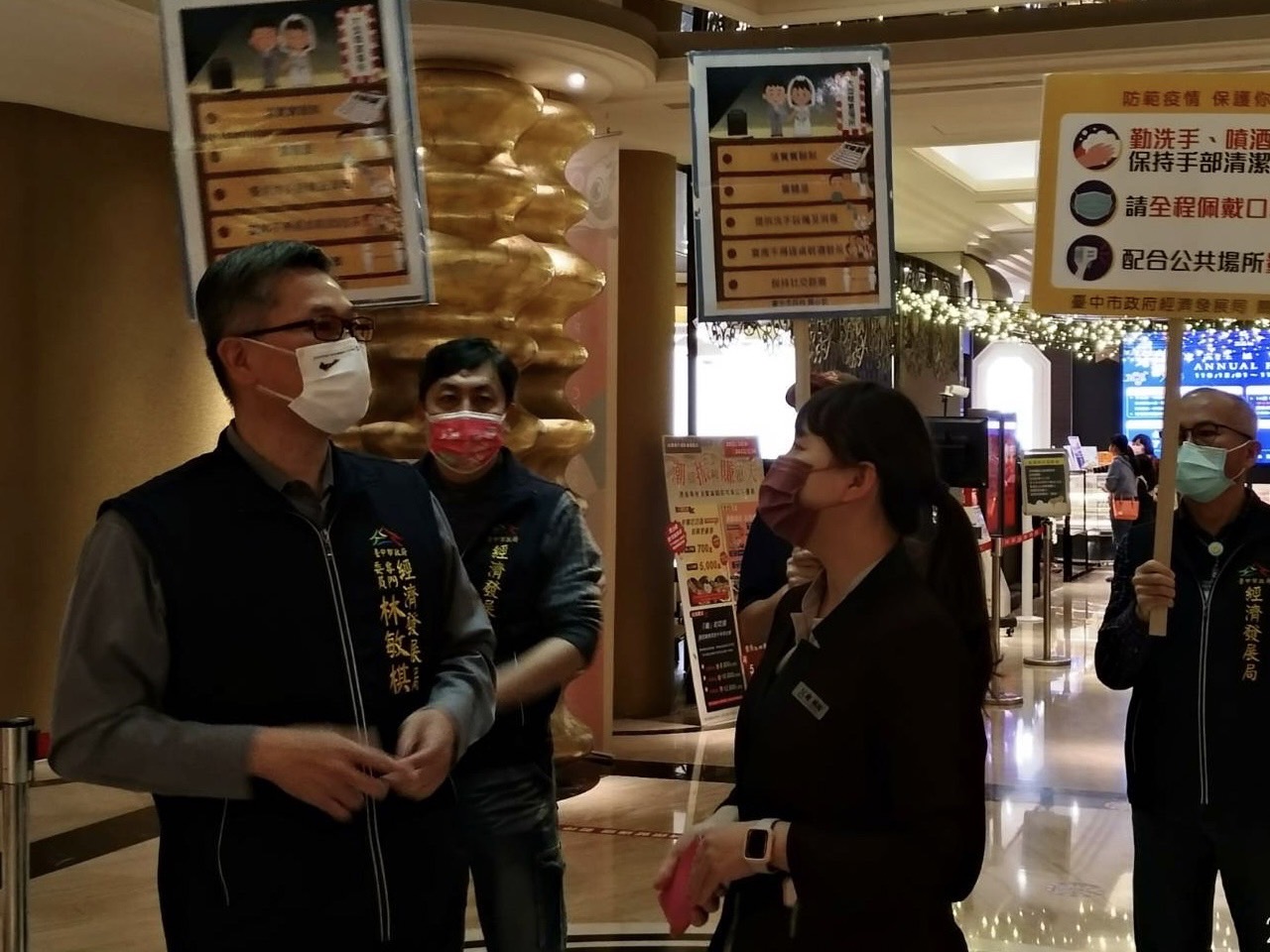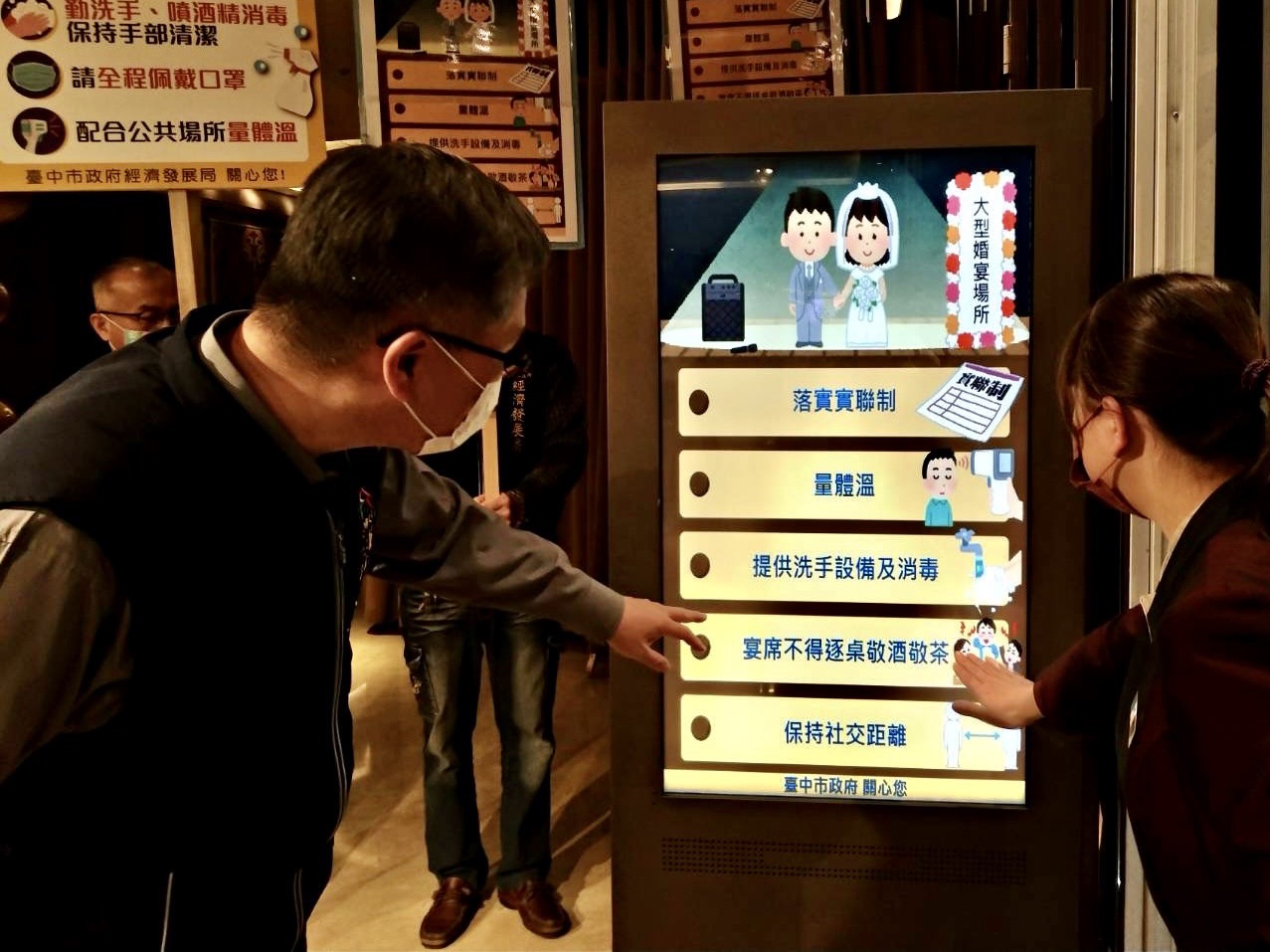 因應桃園機場群聚感染事件延燒,中央流行疫情指揮中心宣布1月9日至24日維持第二級疫情警戒標準並加嚴戴口罩等防疫措施,台中市政府繼上周前往百貨賣場宣導,經濟發展局專門委員林敏棋昨(11)日再度率隊前往大型婚宴場所宣導防疫措施,要求業者嚴禁逐桌敬酒,管控社交距離,並落實實聯制、量體溫、手部清潔消毒,也提醒現場民眾用餐完畢應戴上口罩,做好自我防護。