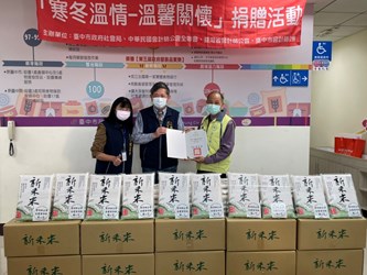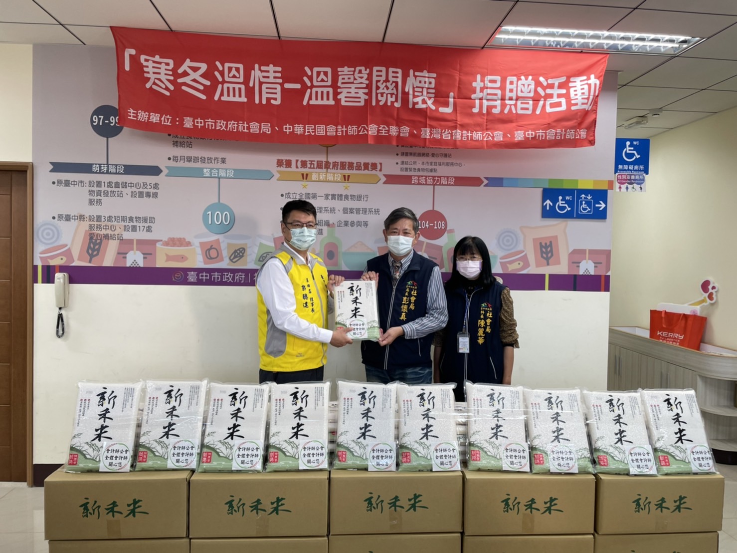 一份11年不間斷的愛心!中華民國會計師公會全聯會、台灣省會計師公會及台中市會計師公會,今(14)日在食物銀行大里店捐贈台中市政府社會局2000包白米,由局長彭懷真代表受贈,之後將分送給台中市愛心食物銀行、台中市原住民族事務委員會、原住民食物銀行及大肚區禾楓慈善老人關懷協會,照顧弱勢民眾。