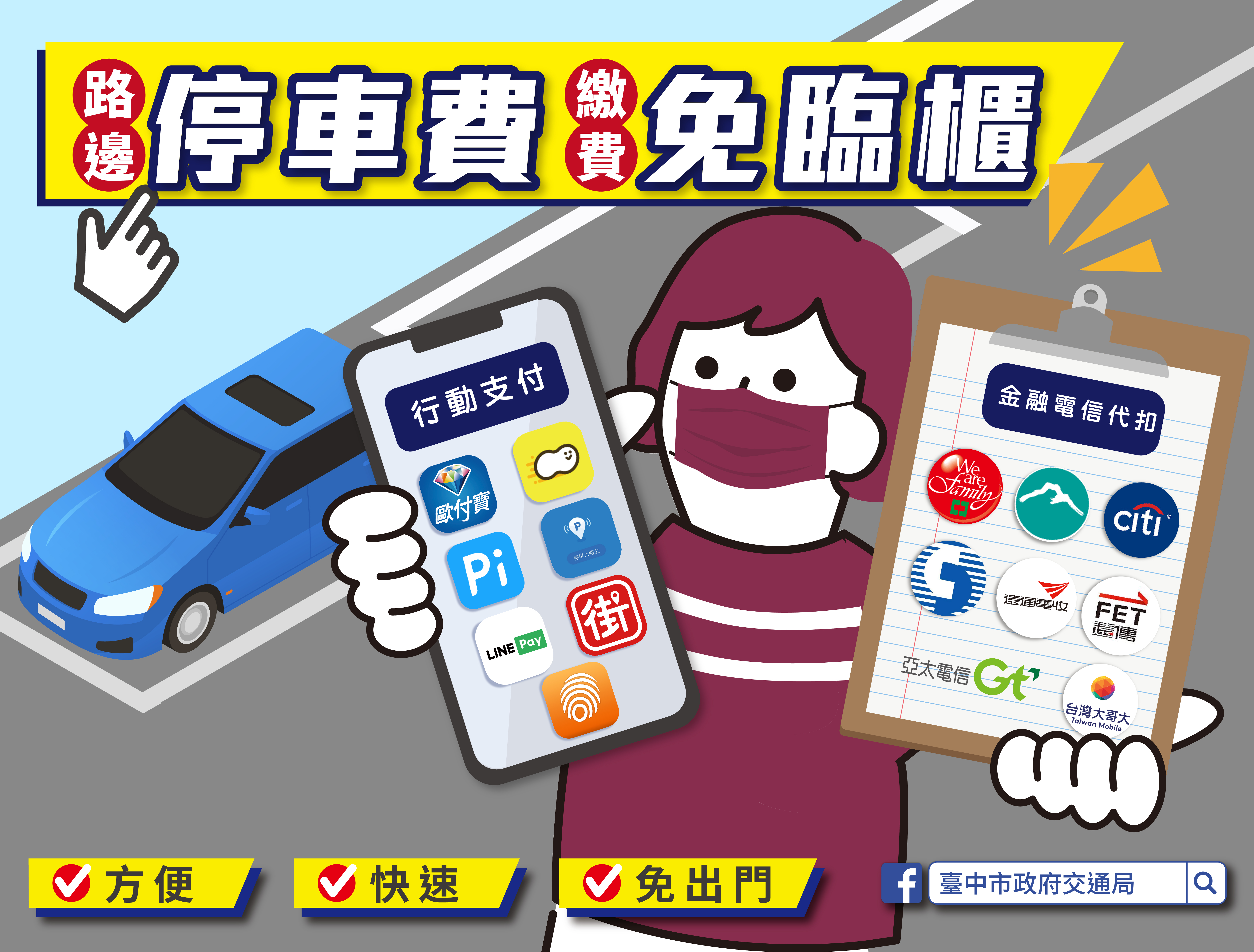 台中市政府交通局便利民眾辦理相關停車業務,除提供傳統櫃台繳納停車費或購買月票外,也積極推動各項代扣繳與線上申辦業務,民眾若有繳納台中市停車費,或是購買停車月票等相關需求,可使用線上繳費、行動支付APP繳費以及金融、電信業者約定帳戶代扣,疫情期間減少出門、降低疾病感染風險,不用親自臨櫃辦理即可完成各項停車業務申辦。