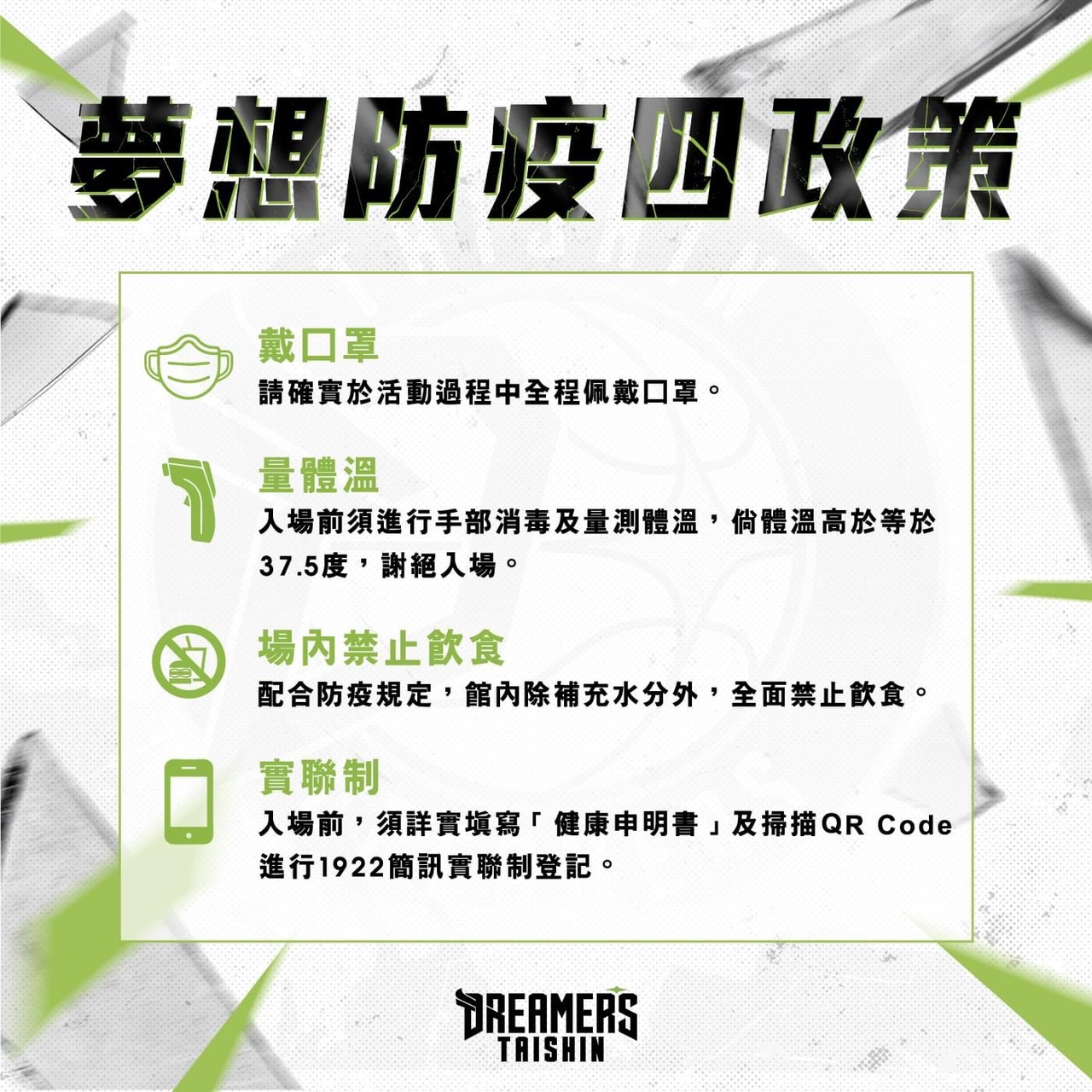 運動局說明,歡迎市民為球隊應援,也請民眾依照中央流行疫情指揮中心落實各項防疫措施,配合實聯制、全程戴口罩、手部消毒等規定,這季台新夢想家共有15場例行賽事於台中洲際多功能運動中心進行,賽事也同步於P.LEAGUE+官方YouTube頻道( https://reurl.cc/D6EXne )網路轉播,歡迎球迷一起觀賽,為球員加油。(2/18*10)*運動局