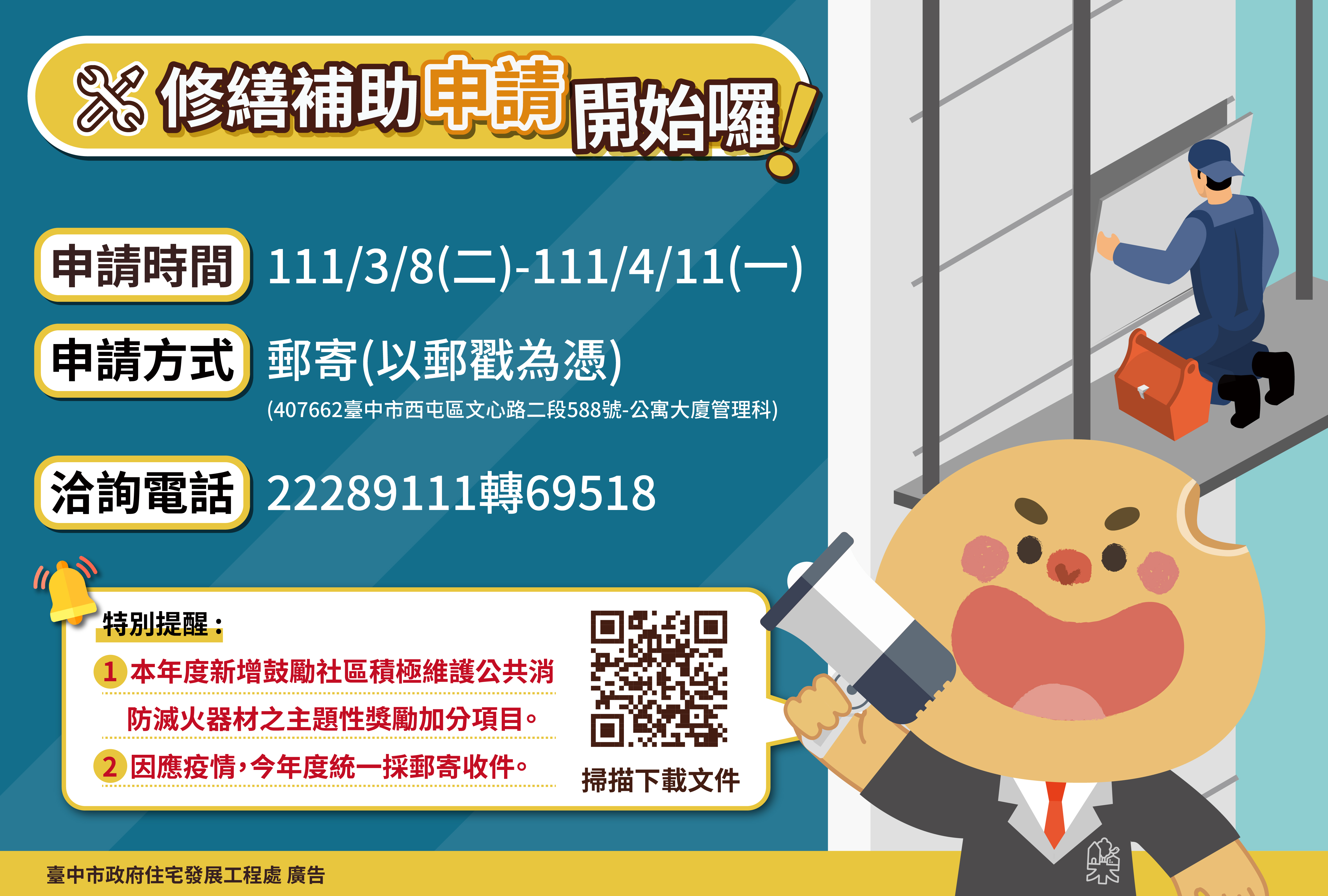 台中市一年一度的公寓大廈共用部分及約定共用部分維護修繕費用補助,自3月8日起受理至4月11日止,補助項目包含公共通道溝渠及簡易既有共用及相關設施修繕、公共消防滅火器材維護及環境清潔衛生維持,維護社區居住品質及公共安全,歡迎社區踴躍提出申請,此外,因受新冠肺炎疫情影響,社區公共環境消毒亦可申請補助,且今年度受理收件方式統一改採郵件遞送。