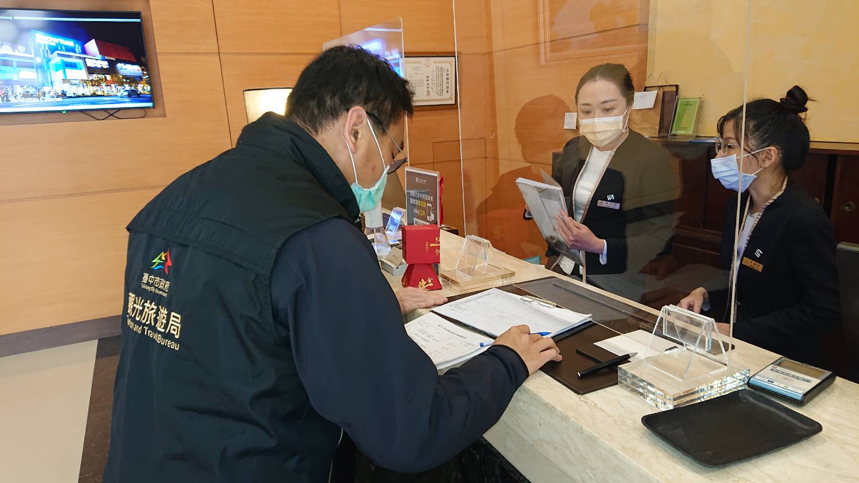 國內疫情升溫,台中市政府觀旅局清明連假防疫不打烊,4月2、3日兩天共稽查台中市28家旅館,督促業者落實實聯制、量測體溫,附屬餐飲場宴席不得逐桌敬酒敬茶,並要求旅館附屬設施等公共場域增加清消頻率,落實員工健康管理,讓旅客安心入住。此外,也針對休閒型自行車道、登山步道及旅客服務中心等觀光場域加強清消,讓民眾安心。