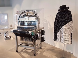 吳佩珊老師於講座中提到,從數百年前的傳統織布機到現代的提花機,可以看到人類歷史的演進,尤其提花織布機在現代科技的加持下,使用的材質和編織的方式更跳脫傳統織布機的束縛,甚至成為藝術家的創作方式,如黃文英老師的作品、纖維工藝展演中心館藏的《金色軍裝》,以及展場內展示邱敬婷老師的《浮游之城》,都是運用提花機進行創作。