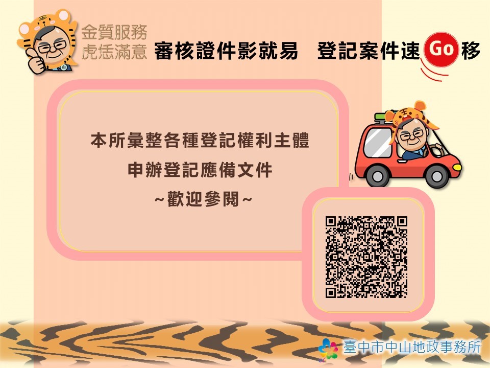 地政局長吳存金表示,為拉近民眾與不動產登記的距離,近年內政部推出「跨域收辦不動產登記案件」、「數位櫃檯」、「線上聲明」及「全程網路申請及非全程網路申請登記」等便民服務,提供民眾多元管道申辦不動產登記,同時強化不動產登記案件申辦便利性,節省辦案時間及交通成本,因此,中山地所也推出「審核證件影就易」創新服務,將不動產登記常見權利主體所需準備的身分證明文件範例,系統化彙整成冊置於官方網站及服務櫃檯,讓民眾參考運用,省下民眾申辦不動產登記前置準備時間。