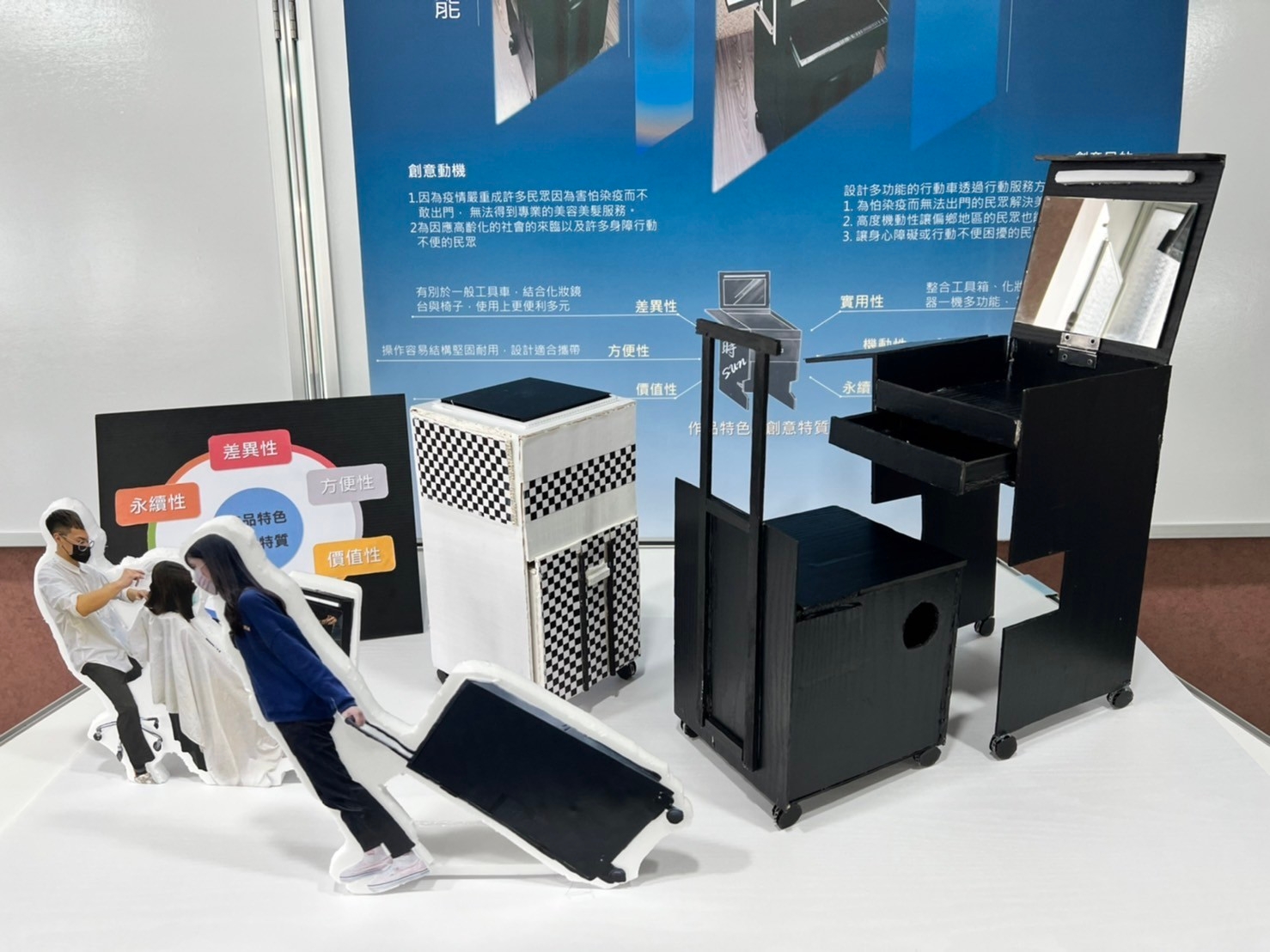 教育局提到,明德高中邱宣喻、黃筠淇、王映竹三位同學以「時 SUN-光電行動工具車」榮獲家政群科創意組全國第1名,近年因新冠疫情蔓延造成學校停課,這三位同學發現人們因此不敢出門整理頭髮,許多美髮沙龍業績一落千丈,人們也無法享受良好的美髮服務,因此他們萌生了想要設計一台可以提供行動服務的工具車,讓設計師不侷限服務場所,也可因應現代高齡化老人照護服務的需求,在具有創意生活設計、造型藝術及美工設計專長的林宇倩主任、鄭全易老師的指導下,透過跨領域的師生學習,從工具車的結構設計、木工的技術指導,再透過網路學習太陽能發電的原理與配電的技巧,從設計圖、製作模型、材料的採購與裁切,經過多次的失敗檢討與修正,終於組裝完成獨一無二的光電多功能行動工具車。