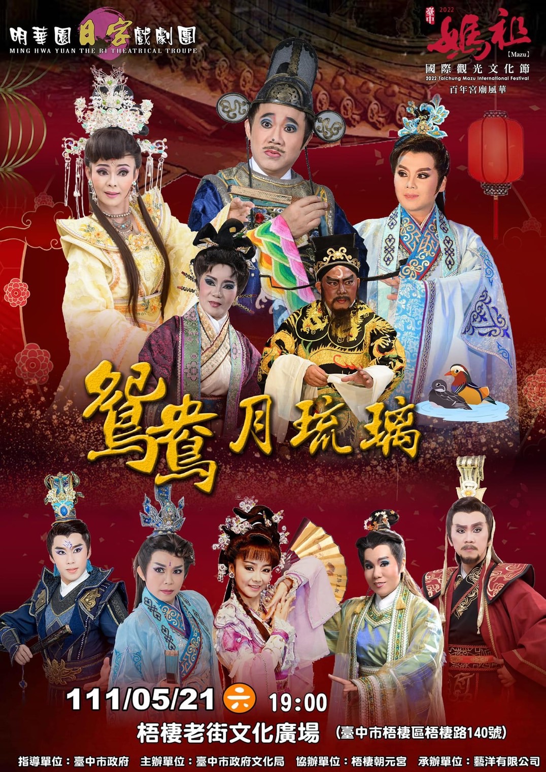 明華園日字戲劇團精采大戲「鴛鴦.月琉璃」今(21)晚7時將在梧棲朝元宮盛大演出,此為台中市政府文化局舉辦2022「宮廟風華」系列活動最終場之一,台中市長盧秀燕今晚將出席觀賞,與民眾做好防疫措施下一起同樂。