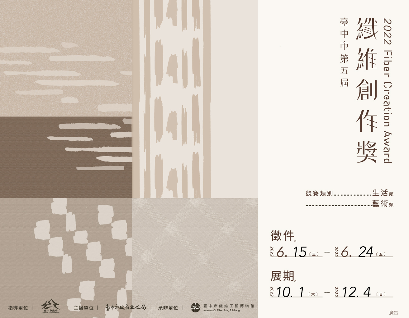 台中市纖維工藝博物館辦理「第五屆纖維創作獎」,將於6月15日至6月24日開放報名,參賽類別分為「生活類」及「藝術類」二類,歡迎全國利用天然或人造纖維材質創作的好手踴躍參加,競逐首獎12萬元、二獎8萬元、三獎5萬元、優選3萬元及入選獎狀等多種獎項!