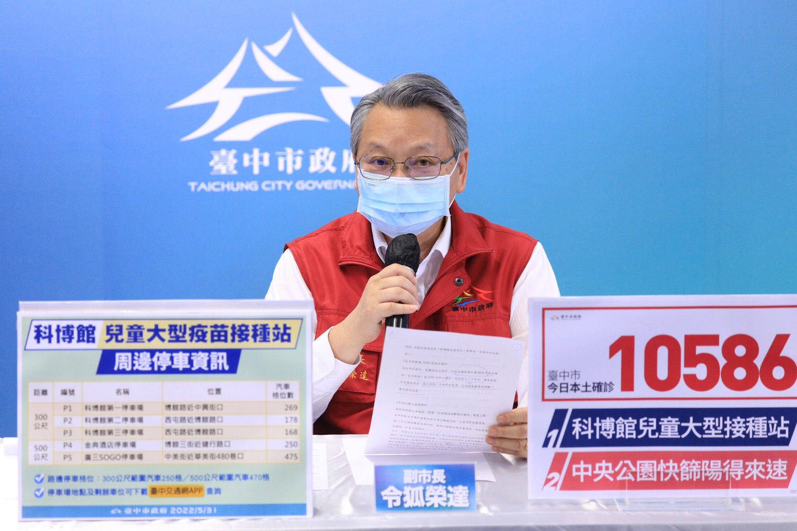 今(31)日全國新增8萬656例本土確診,台中市新增1萬586例本土確診,副市長令狐榮達今日召開疫情線上記者會表示,昨天中央宣布6月1日起,在六都開設兒童疫苗大型接種站,台中是在自然科學博物館,接種時間為6月1日至5日,這5天由於醫護人力相當吃緊,因此中央公園「大型快篩陽確診得來速」這段期間將調整服務時間及名額,請市民朋友留意。