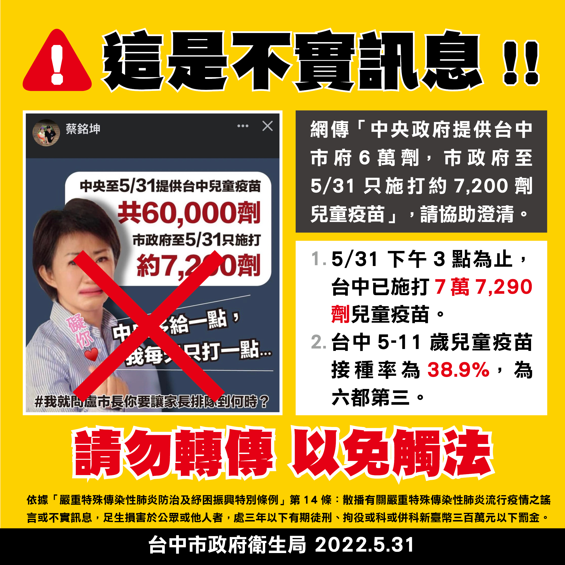 有關網路個人臉書涉散播不實訊息,台中市衛生局澄清指出,統計至5/31下午15:00為止,在台中市接種兒童BNT施打數為4萬0765人次,另兒童莫德納疫苗累計施打為3萬6525人次,因此台中兒童施打疫苗數共7萬7290人次,與民眾張貼訊息聲稱「市府至5/31只施打約7,200劑」不符。