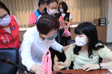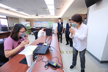 盧市長指出,因應政策昨日宣布,預計下週一啟動發放,她特別關心各個系統的快篩試劑整備情況,包括基層守望相助隊、公所臨櫃人員、里鄰長及調解委員等,這些人員都會透過區公所系統發放,因此今天特別到南屯公所視察,感謝公所人員與志工,在端午連假期間協助分裝快篩試劑,她也準備一些粽子給同仁,感謝同仁犧牲端午假期整備物資,祝福大家端午佳節闔家安康。