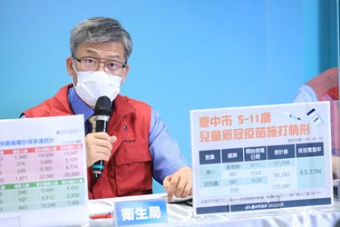 盧市長指出,台中市5至11歲兒童疫苗接種情況,在各醫療院所、校園老師、醫護人員的共同努力下,統計至今日上午已突破63.33%,兒童疫苗累計接種數已達12萬2881劑,市府會持續努力,守護台中市的兒童。