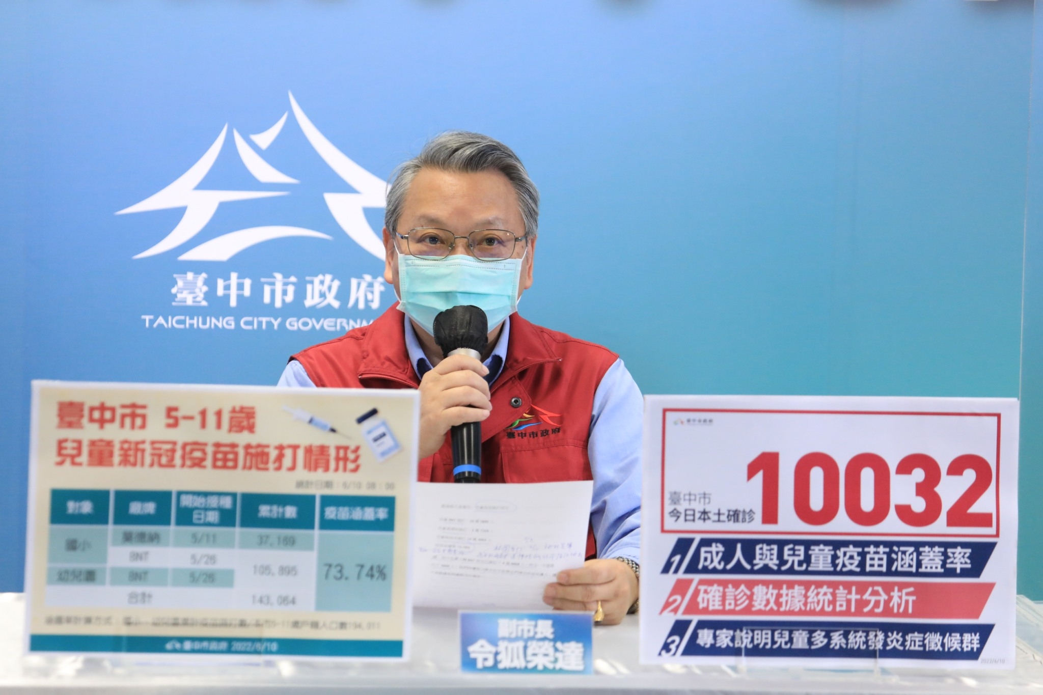 今(10)日全國新增本土確診6萬8311例,台中市新增本土確診1萬32例。副市長令狐榮達今日於疫情線上記者會表示,從確診數看,台中仍然是疫情的高原期,呼籲大家做好防疫措施;另台中市5至11歲兒童疫苗涵蓋率已達73.74%,而國、高中生第三劑BNT已施打4萬8868人,市府將持續努力替全台中的兒童、學生們增加疫苗保護力。
