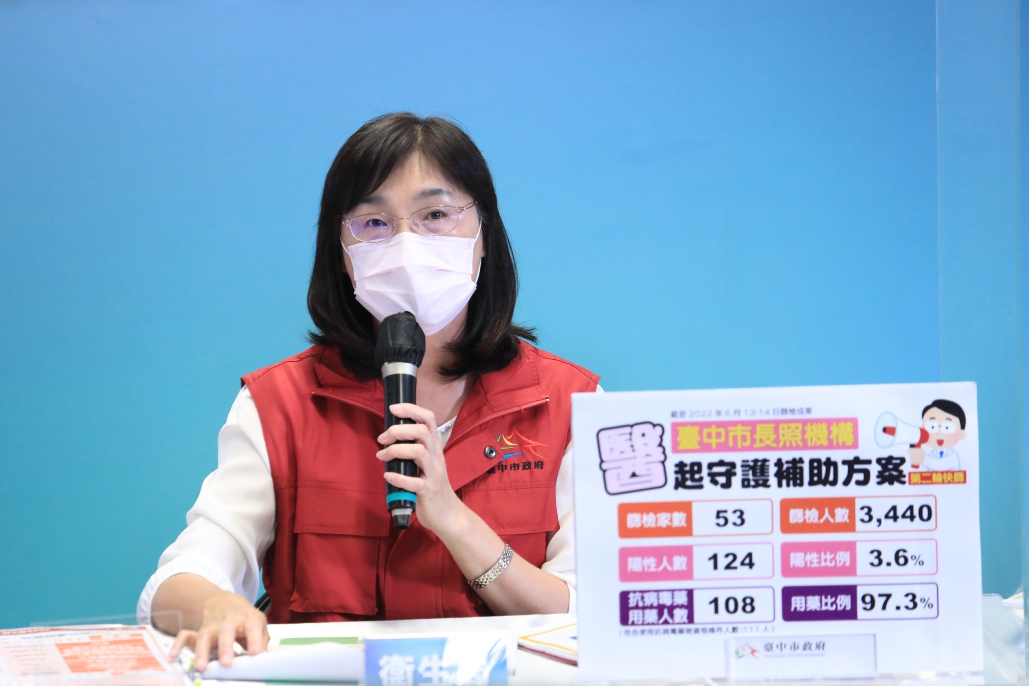邱副局長說,市府已啟動第二輪「醫起守護」篩檢計畫,61314兩日,台中市長照機構已篩檢53家、篩檢人數3440人,其中陽性124人,陽性比例3.6%,抗病毒藥用藥人數108人,用藥比例97.3%