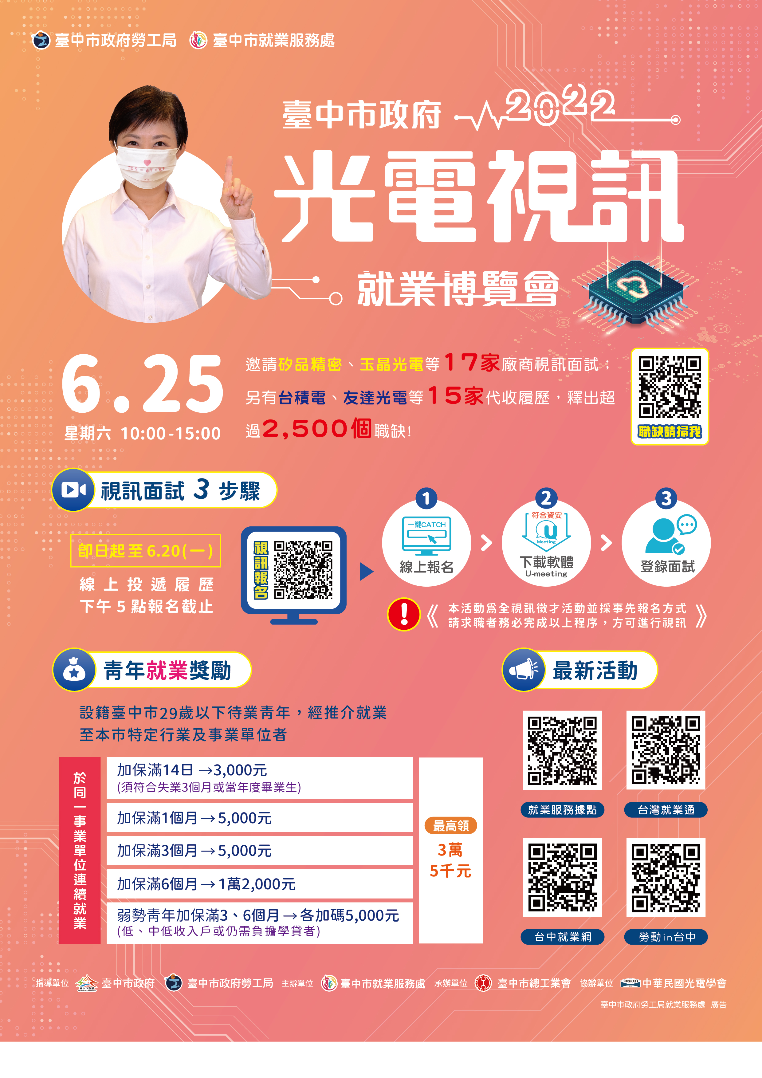 勞工局長張大春表示,市長盧秀燕相當重視市民及青年就業議題,市府除全力爭取疫苗,讓施打涵蓋率優於全國平均外,勞工局也針對畢業求職季,全國首創「視訊徵才2.0」全視訊徵才服務,並在6月25日舉辦全程線上的「光電視訊就業博覽會」,邀請友達晶材、矽品精密、永勝光學、今國光學、昇陽國際、玉晶光電、華凌光電、伯特光電、台灣航空電子等17家廠商;另由台積電、上銀科技、千附精密、台灣佳能、友達光電、佳凌科技、台灣美光、大立光、台灣康寧等15家廠商代收履歷,共32家廠商,釋出2,500個職缺,感謝各公司在疫情期間力挺台中就業。