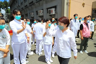 國內本土疫情持續發展,台中市長盧秀燕今(25)日陪同蔡英文總統視導國軍台中總醫院,慰問醫護人員,並訪查IGRT放射腫瘤治療中心。蔡總統表示,感謝醫護守護民眾健康,相信中央地方共同攜手,一定能度過疫情挑戰;盧市長表示,感謝國軍台中總醫院,作為台中市防疫網絡第一線英雄,迅速應變超前部署,配合推動各項防疫措施,共同完成許多政策,謝謝醫護人員的辛勞付出,一起守護市民健康。