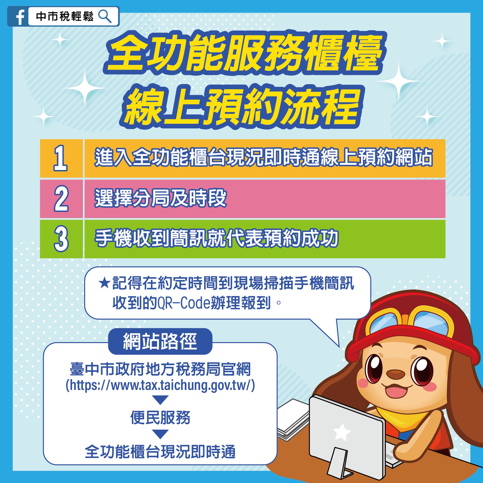 地稅局補充,「全功能櫃台現況即時通」提供查詢各分局全功能櫃台服務狀況,讓民眾可即時掌握櫃檯等待人數,時間調配更靈活。各項申辦可善加利用地稅局官網( https://www.tax.taichung.gov.tw/ )線上申辦服務,節省往返奔波時間及減少疫情期間外出洽公風險,如有任何問題,可撥打0800-000321免付費電話,或04-22585000按1接全智慧客服中*心,將有專人提供服務。(6/27*16)*地方稅務局