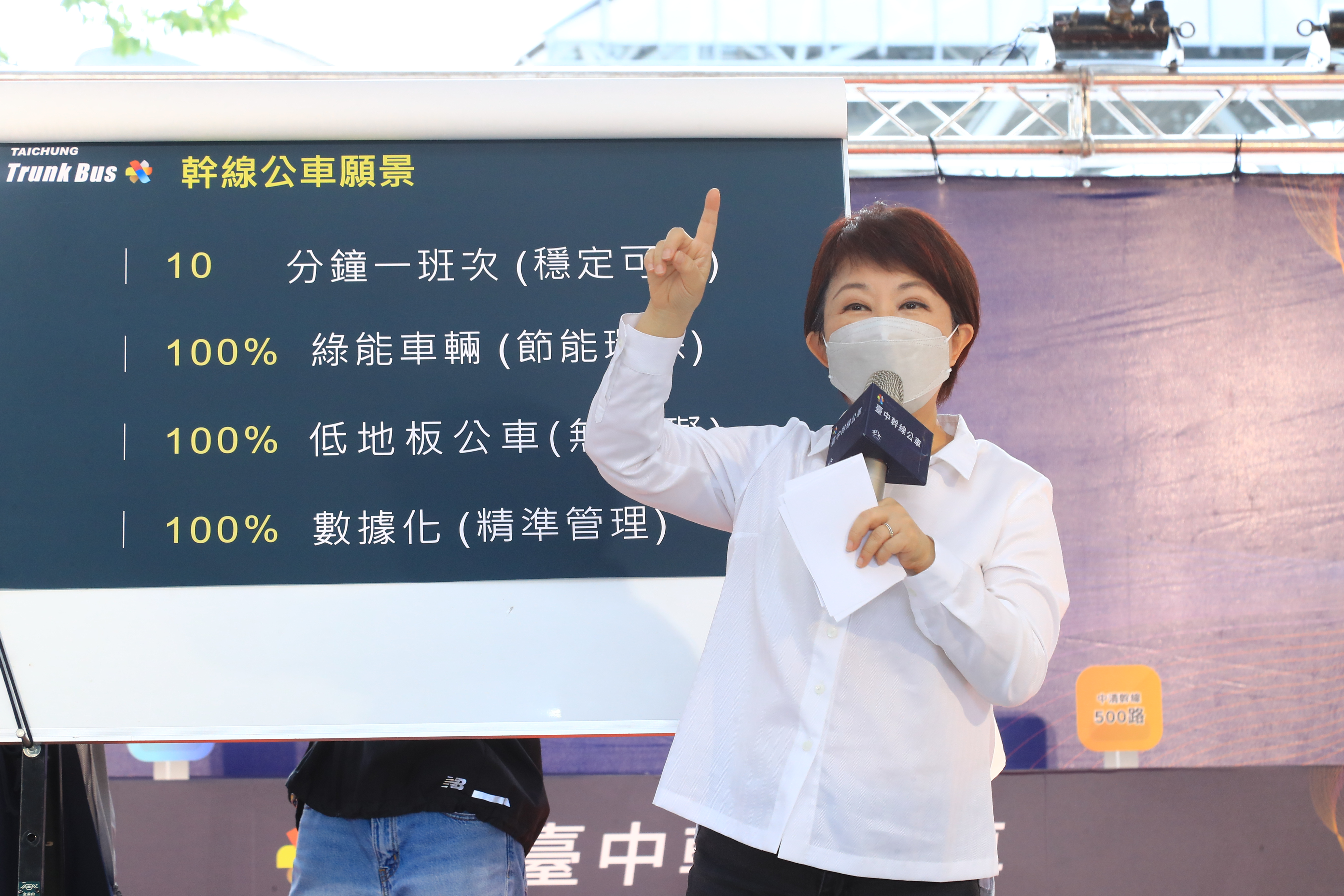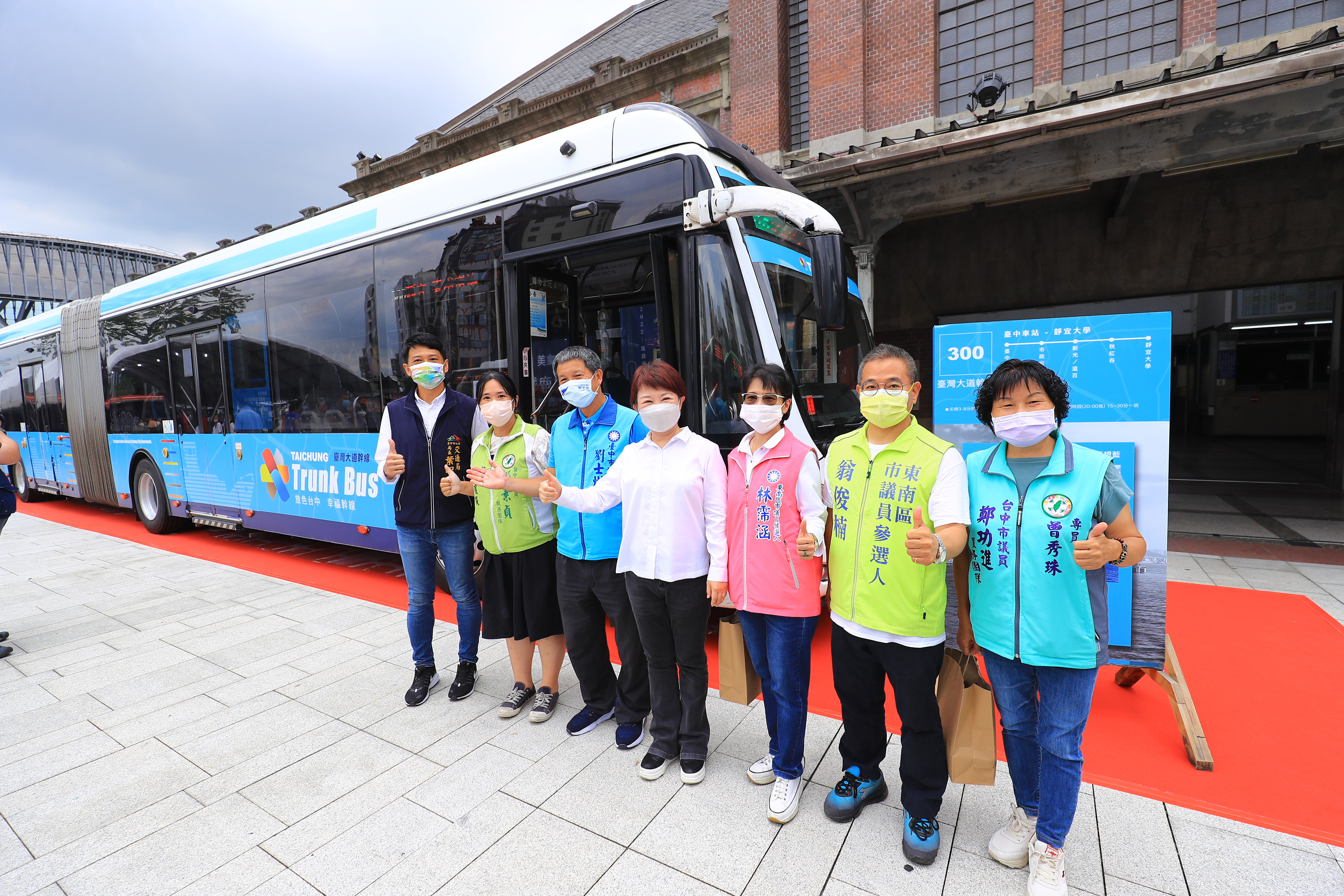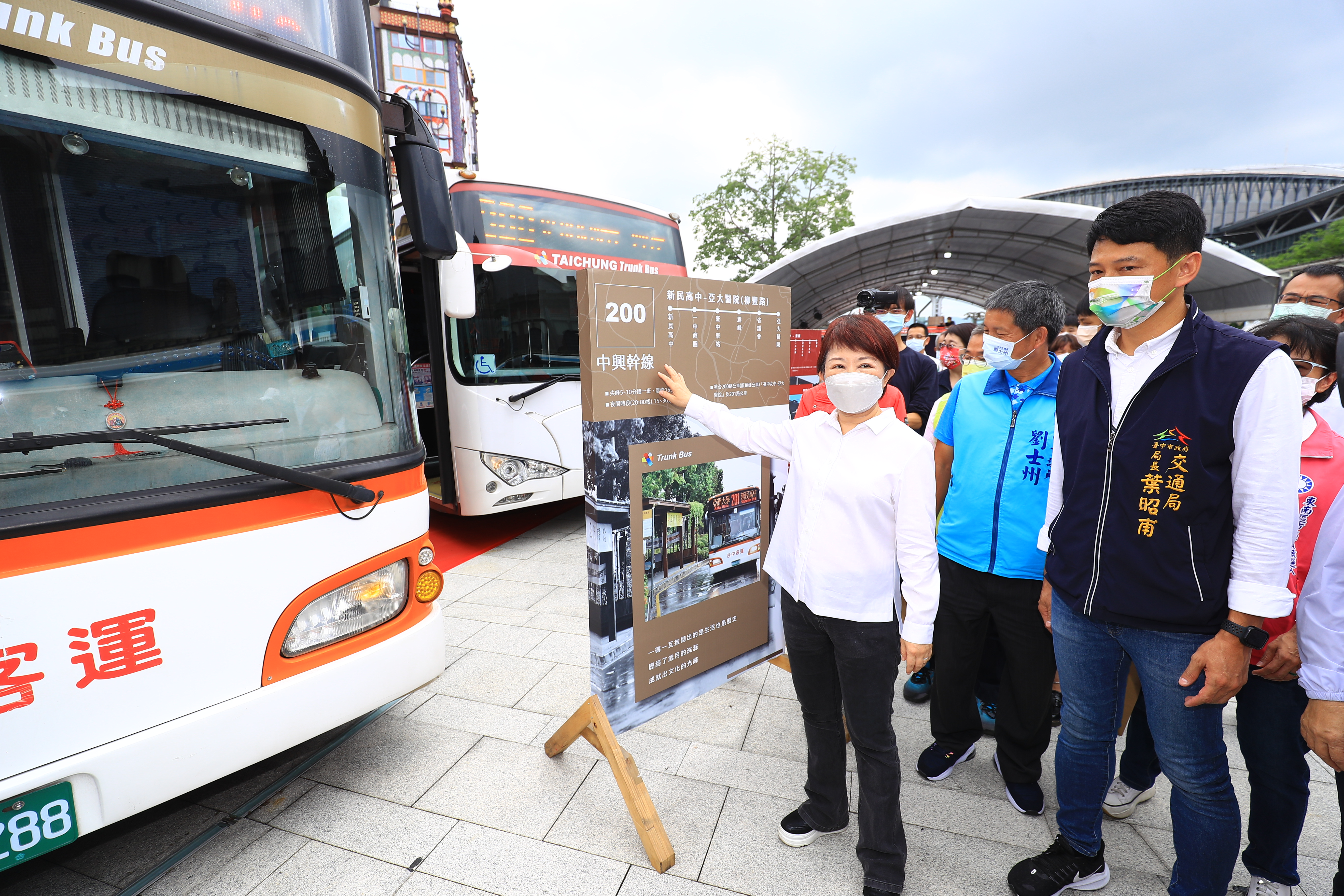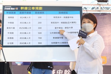 盧市長提到,台中電動公車數量全國最多,六大幹線公車番號分別為100、200、300、500、700、900,因應搭乘人數提高班次,尖峰10分鐘一班,離峰15分鐘一班,均採低底盤無障礙公車,另以6個顏色加強識別系統,站牌、候車亭等各項設施均統一色系,讓大家容易辨識。