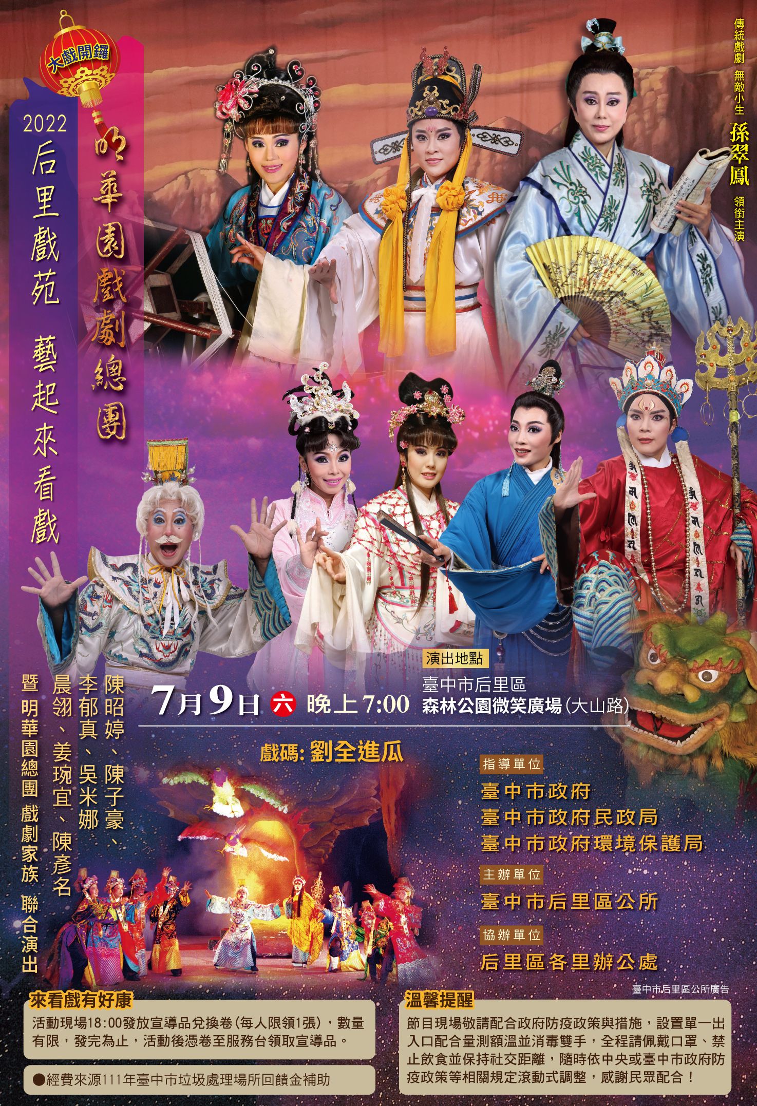 台中市后里區公所明(9)晚7時將於后里森林公園舉辦「后里戲苑-藝起來看戲」活動,特別邀請知名明華園戲劇總團當家小生孫翠鳳領銜主演經典戲曲《劉全進瓜》,讓市民可就近欣賞歌仔戲優美多樣的新面貌。民政局長吳世瑋表示,「歌仔戲」是台灣的重要文化瑰寶,特有的唱腔曲調,生動刻劃地方民間故事及語言色彩,歡迎民眾一起來后里支持傳統藝術,共度美好的夏日夜晚。