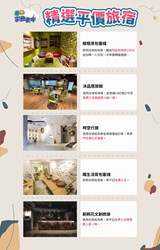 此外,台中福華大飯店推出超優惠價格的「FUN 暑假」及「科博探險趣」住房專案,「FUN 暑假」專案平日2人成行2,799元起,加贈200元抵用券、「科博探險趣住房專案」4人成行4,688元起加送國立自然科學博物館門票;台中長榮桂冠酒店住房送德國知名Hape玩具,學生再享長榮咖啡廳自助百匯8折優惠,而平日使用悠遊國旅補助入住久窩行旅雅致客房,享免費升等成豪華客房;背包41青年旅館,住房加碼贈送限量精美小禮物;想窩11餐旅館住宿享用午晚餐再贈哈根達斯冰淇淋。