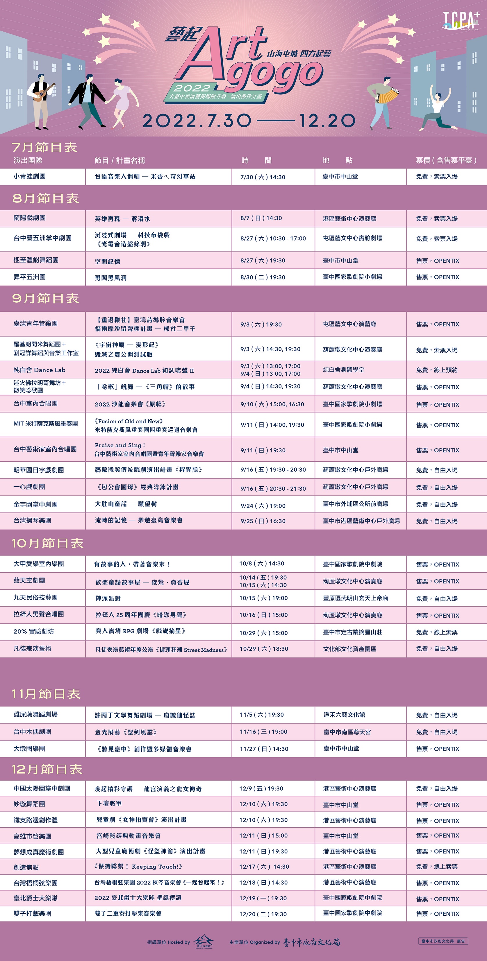 今夏全國優質演藝團隊在台中「搬好戲」囉!台中市政府文化局7月30日起至12月20日推出「藝起Art go go—山海屯城四方起藝」系列藝文振興活動,邀請全國演藝團隊在台中山、海、屯、城各區展開36場演出;更首創全國創立「大台中地區藝文品牌」(Taichung City Performance Art plus),並同步在「兩廳院文化生活」售票網架設品牌旗艦館「台中市文化局 2022 TCPA+」,歡迎民眾一起到台中欣賞精采好戲。