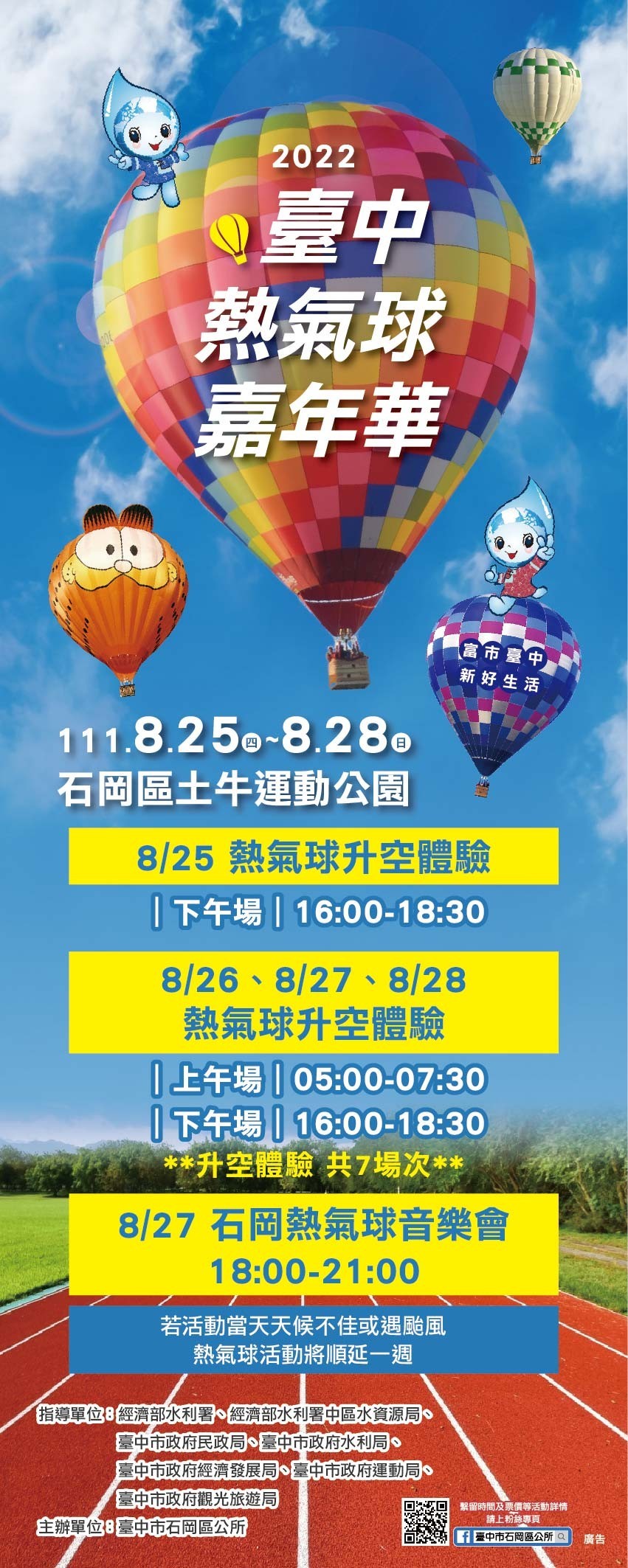 劉區長指出,除熱氣球升空體驗外,8月26日下午4時至6時結合逍遙音樂町,邀請到雙金歌王沈文程及在地團體帶來精彩表演;另8月27日還有水資源宣導音樂晚會,邀請麋生、八三夭等歌手團體登台表演,結合夜間光雕噴火秀及600秒煙火秀,將璀璨閃耀大甲溪畔。