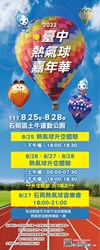 睽違已久的第二屆台中山城熱氣球嘉年華,將於8月25日至8月28日在石岡區土牛運動公園登場。台中市政府民政局表示,此次活動規劃7場熱氣球繫留升空體驗,現場排隊購票,每張票均一價500元,活動開始前半小時開始售票,限量150張;此外,還有音樂晚會、華麗煙火及光雕噴火秀,歡迎民眾到石岡體驗,鳥瞰山城美景。