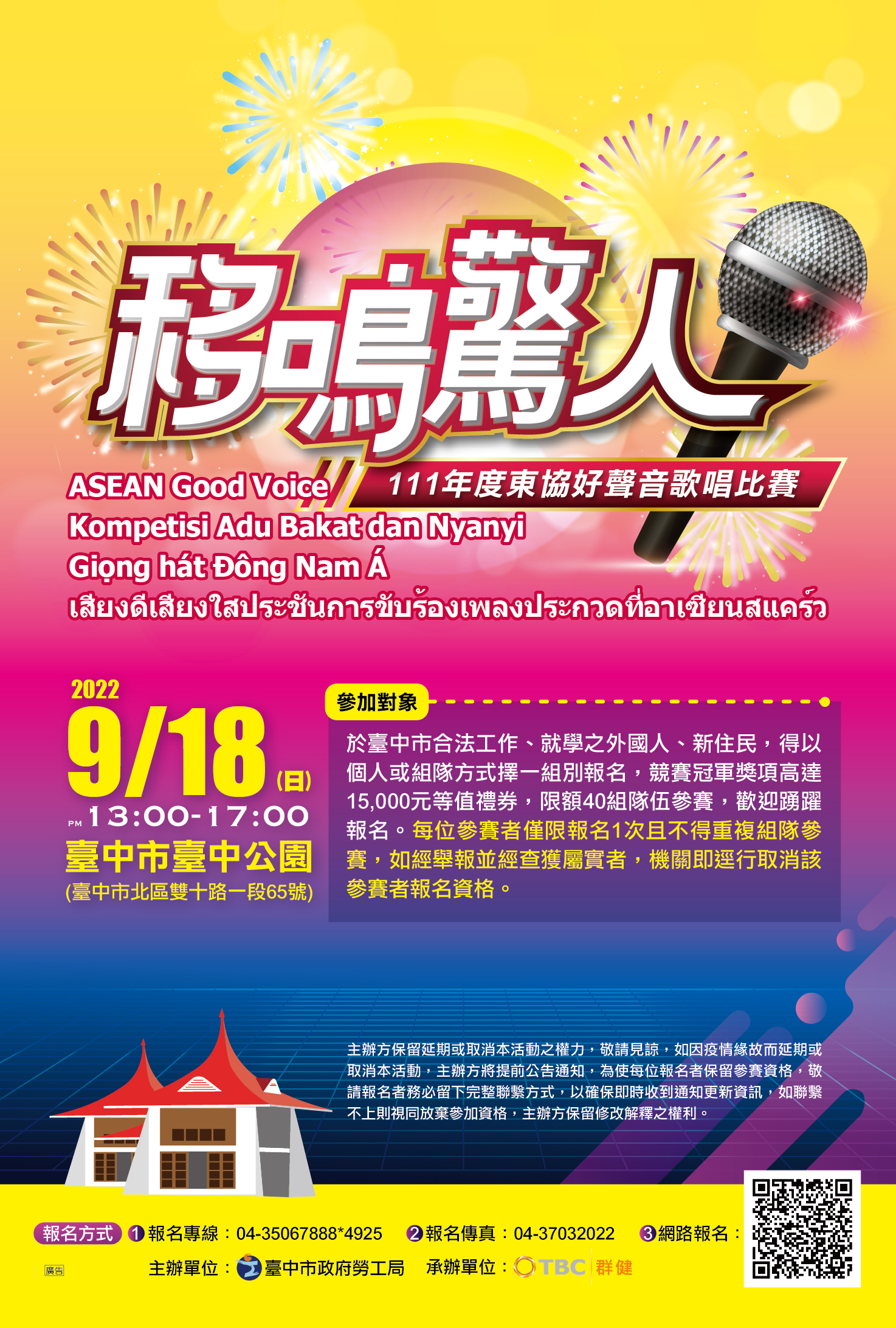 勞工局長張大春提到,為鼓勵市民及移工組隊參賽,這屆歌唱比賽特別增設友善互動獎項,獲獎者將頒發8,000元商品禮券;這次活動獎項也相當豐厚,總獎項高達96,800元!即日起開放報名至830日止,如提前額滿則提前截止,有意報名者請從速。相關活動資訊可電洽04-35067888分機4925洪小姐;另為協助移工及新住民進一步了解活動及報名資訊,活動專頁也貼心提供四國語言翻譯,歡迎至https://2022aseanvoicesinging.mystrikingly.com/查詢。(8/14*8)*勞工局