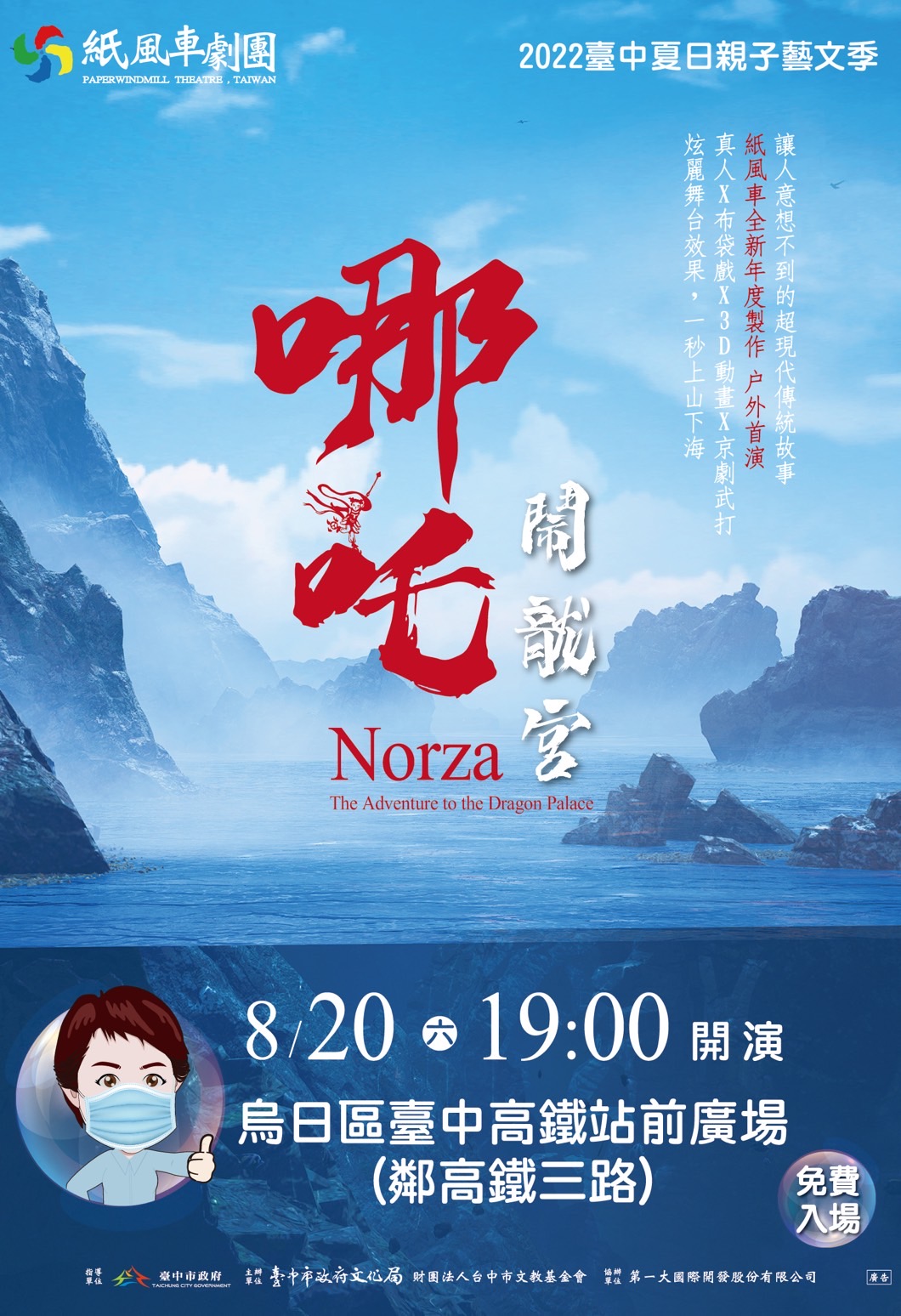 紙風車劇團創團30週年新作《哪吒鬧龍宮》,戶外首演從台中出發!台中市政府邀請紙風車劇團於今(20)日晚上7時,將在高鐵台中站前廣場演出,市長盧秀燕將到場和民眾欣賞精采演出,感謝紙風車劇團每有大型創作,總是第一個與台中市民分享,也希望藉由這次演出,在疫情趨緩後帶給市民歡樂和撫慰。