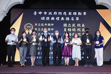 盧市長說,感謝校長及老師們在疫情期間的付出,保護學生健康也兼顧受教權,共同守護校園社區環境,抗疫工作持續進行,市府與學校一起努力。另副市長令狐榮達也在會中頒發防疫英雄勳章,感謝疫情期間協助施打疫苗的有功教育人員。
