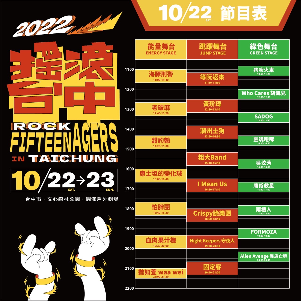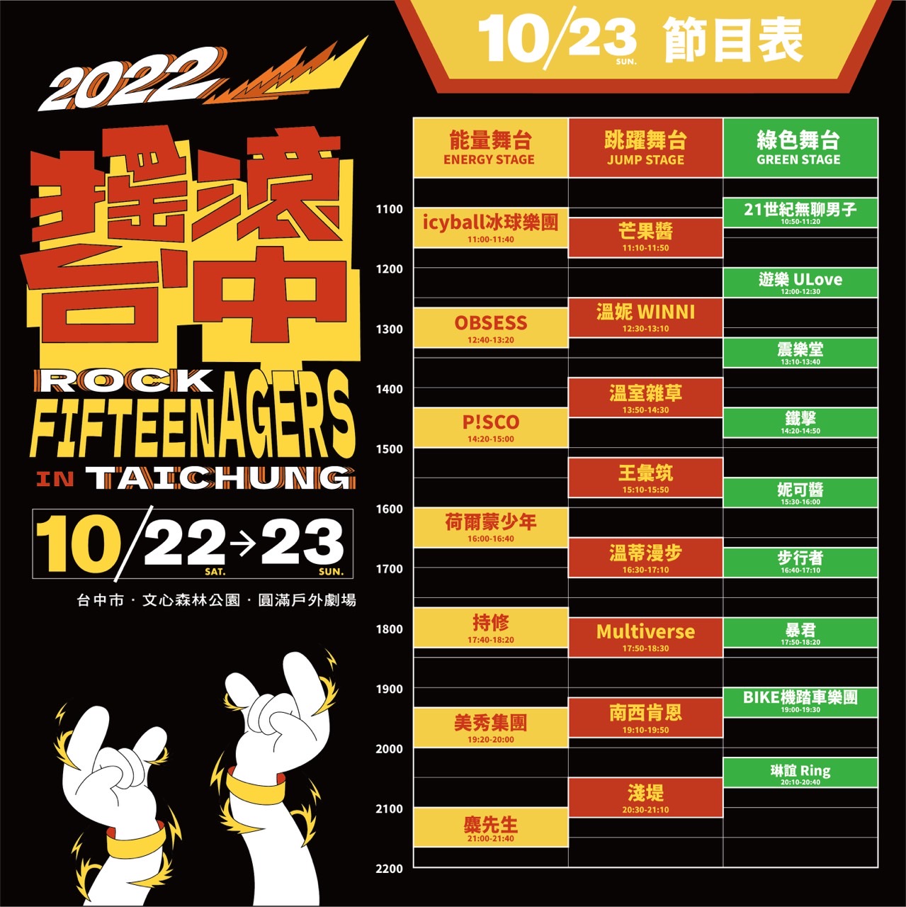 新聞局說明,「搖滾台中」今年適逢15週年,以「青少年」為主題,前2年受疫情影響只能以線上方式舉辦,今年睽違已久再次舉行實體活動,重回文心森林公園暨圓滿戶外劇場,讓這次活動更具意義。此次除有樂團演出之外,也特別與邊緣人市集合作特色主題「青春,逗」市集,配合即將邁入15歲的搖滾台中,以「Fifteenagers」為主題,號召忠實搖滾迷或今年第一次到搖滾台中的朋友們,一同喚醒衝動,拾回熱情!