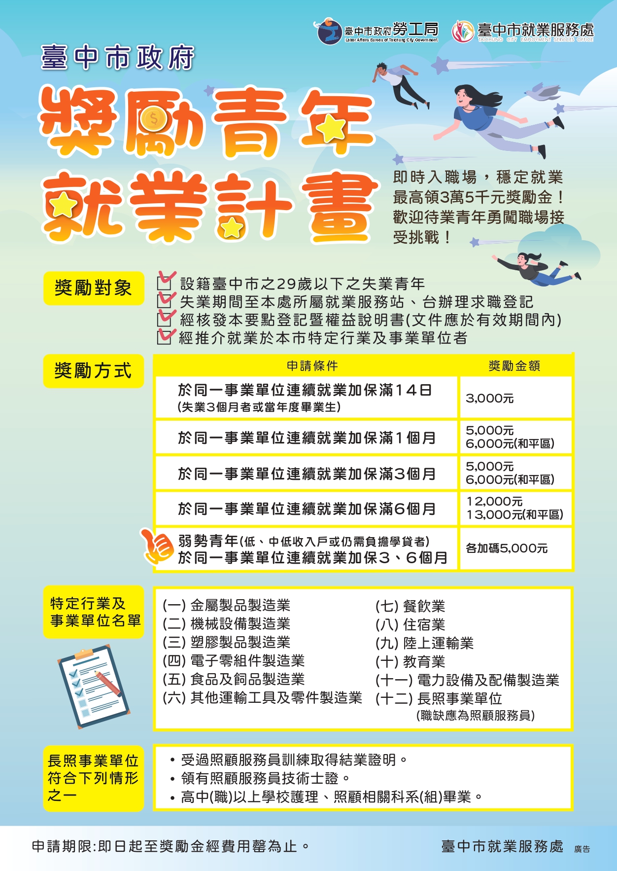 鼓勵待業青年積極尋職、穩定就業。台中市政府勞工局持續推動「獎勵青年就業計畫」,今年全國首創新增「弱勢青年就業獎勵金」,針對設籍台中市29歲以下低收、中低收入戶或背負學貸壓力的弱勢青年,經推介就業滿3、6個月,各加碼發給5,000元獎勵金,就業滿6個月最高可領3萬5,000元獎勵金,截至今年9月15日共協助超過50名弱勢青年就業成功,減輕就業初期經濟負擔。