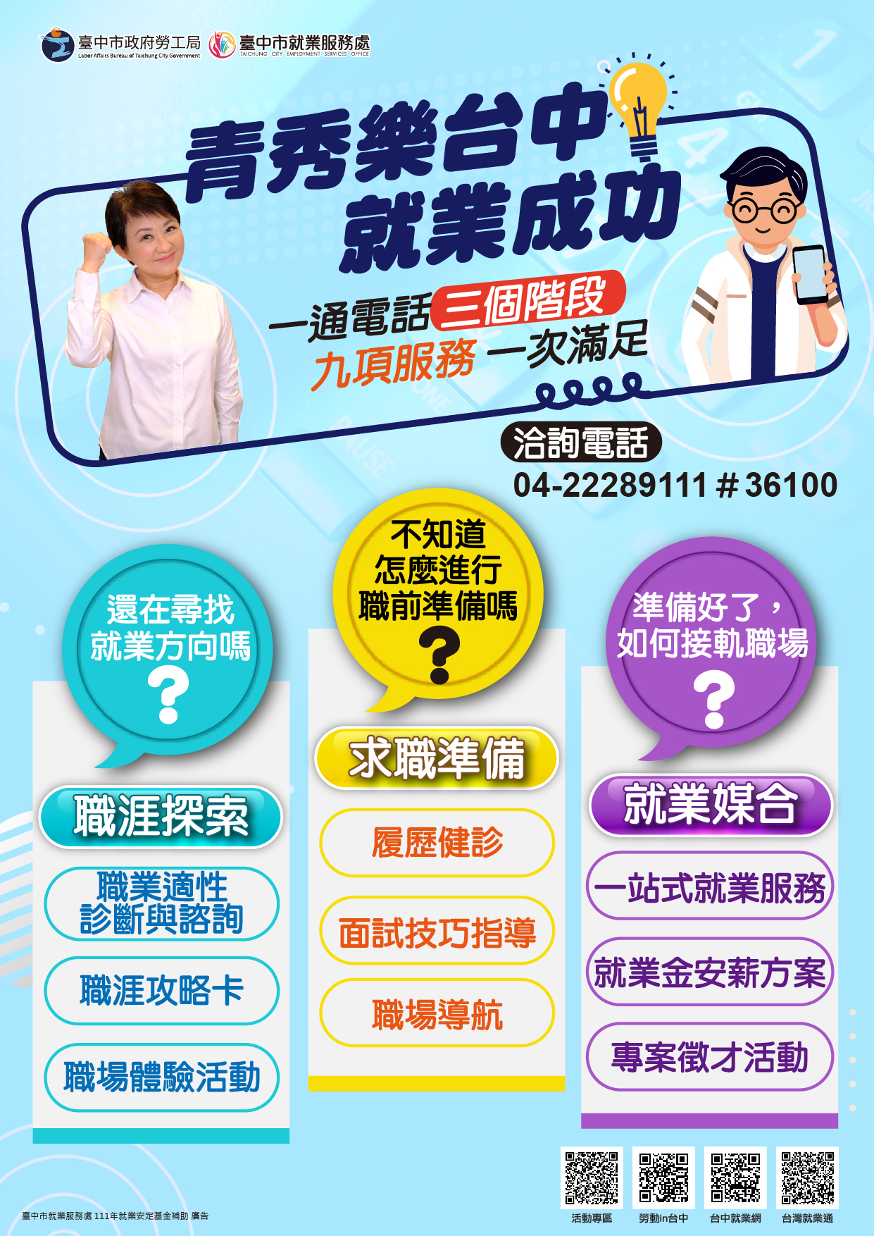 就服處說明,為協助青年及市民順利就業,10月15日「台中市政府就業博覽會」將在台灣大道市政大樓府前廣場熱鬧登場,邀請艾司摩爾、玉晶光電、大立光等110家次廠商參與,共釋出6,500個職缺,並規劃設置「風能專區」、「科技業專區」、「服務業專區」、「製造業專區」、「客運業專區」、「三井LaLaport專區」、「視訊徵才專區」等7大特色招募專區,歡迎求職民眾踴躍參加,詳情請至就服處官網(https://www.eso.taichung.gov.tw/834066/Lpsimplelist)查詢,更多活動詳情也歡迎電洽台中市就業服務處04-22289111分機36100。(10/1*8)*勞工局