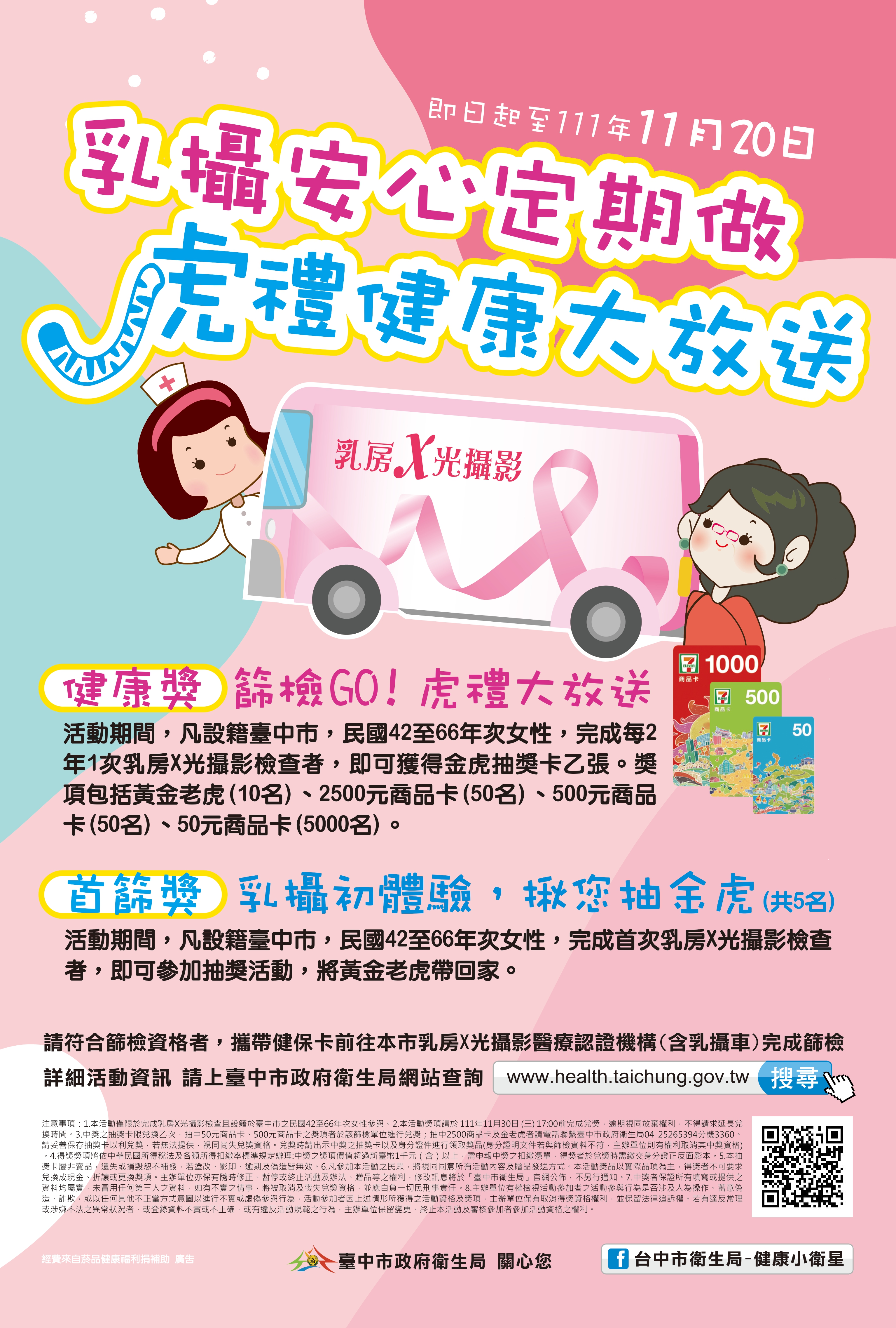 台中市政府衛生局響應十月國際乳癌防治月,辦理「乳攝安心定期做、虎禮健康大放送」乳癌篩檢推廣活動,提醒民眾定期接受乳房攝影檢查,掌握治療黃金時期。衛生局表示,民國4266年次且設籍台中市的女性,即日起至1120日至乳房攝影醫療院所或社區乳攝車完成乳房X光攝影檢查,即可得抽獎卡,有機會獲得2500元、500元、50元的品卡及黃金老虎。