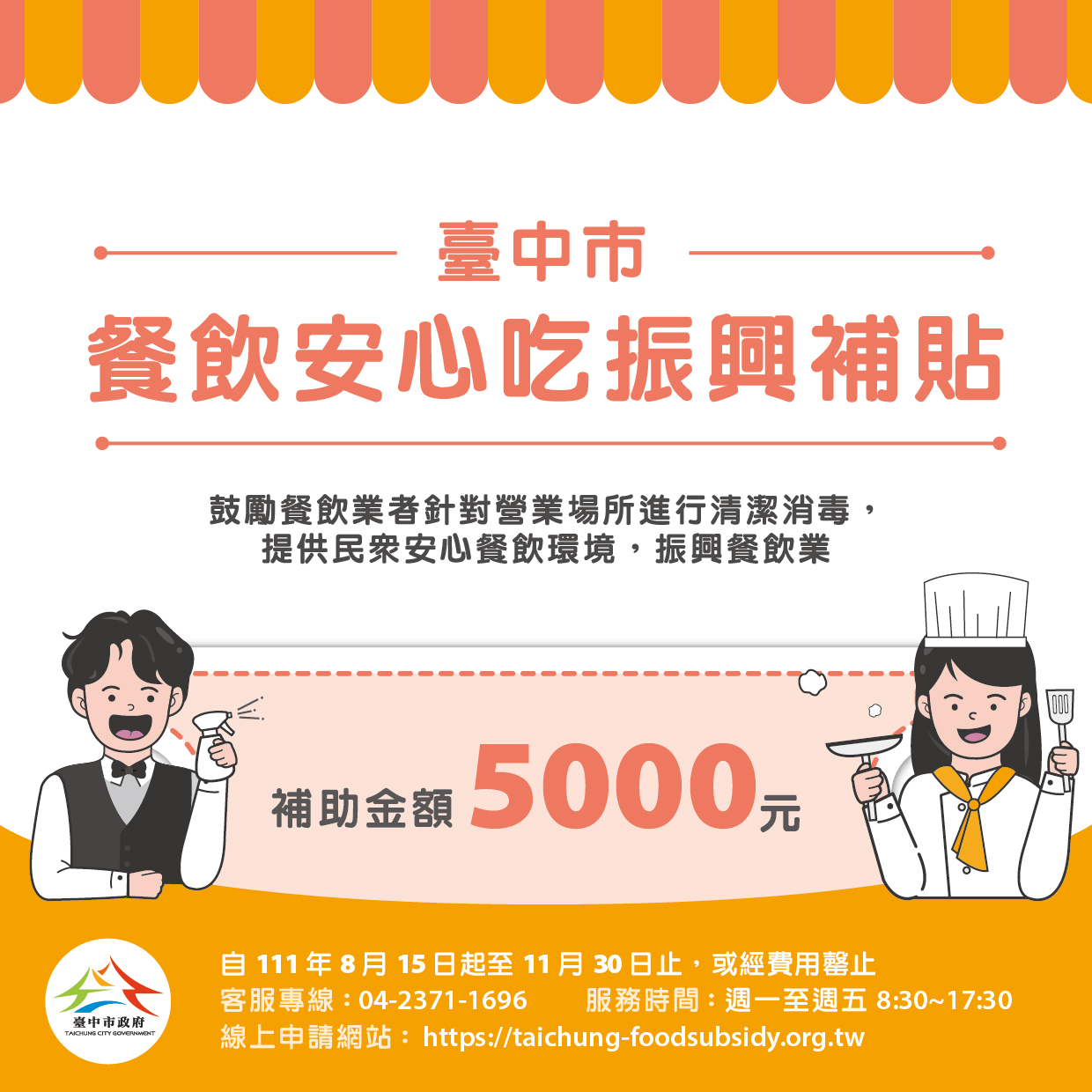 為協助受疫情影響的餐飲業者,台中市政府推出「台中市餐飲安心吃振興補貼」,鼓勵清消、建立安心餐飲環境,每家5千元,目前已近1萬1千家申請,為便利業者申請、加強服務,特別延長收件至今年11月30日,以線上申請方式,透過手機拍照上傳資料即可完成,歡迎今年7月15日前取得稅籍,包含「免開發票」及「開立發票」的餐飲業者把握機會申請。