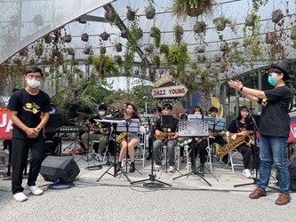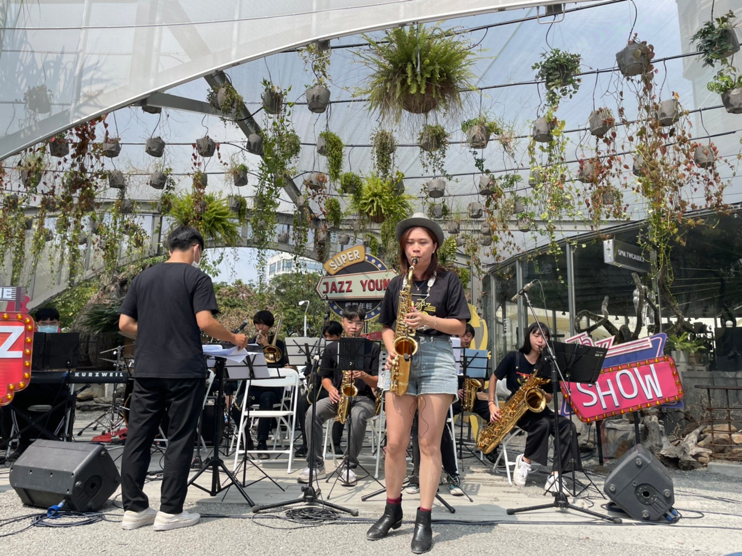 文化局今日在PARK2草悟廣場舉辦活動記者會,由台中青少年爵士大樂團帶來開場表演,特別邀請到第一屆青少年爵士樂團學姐林映辰與青少年樂手們一同演出年度主題曲,陳局長則驚喜化身指揮家,帶領樂團奏出台中爵士音樂節的圓滿樂章,為演出帶來高潮。