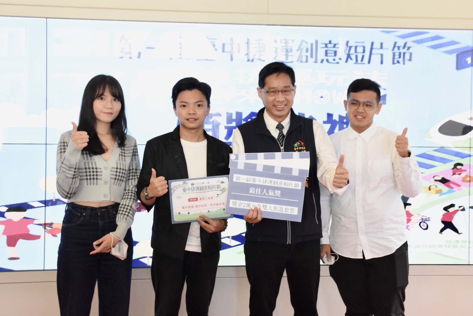 今日頒獎典禮由經發局長張峯源、台中捷運公司董事長林志盈及評審老師逢甲大學教授鄭圓圓、亞洲大學助理教授楊靜瑜共同頒獎。張局長表示,為打造台中捷運經濟生活圈,市府啟動「捷運新經濟 台中邱比特」計畫系列活動,首波活動「台中捷運創意短片節」,希望藉由民眾及旅客力量,以影片方式呈現捷運與這座城市的想像,激發捷運多樣玩法,同時吸引更多市民朋友搭捷運遊台中,進一步促進沿線店家消費,帶動城市軌道經濟。