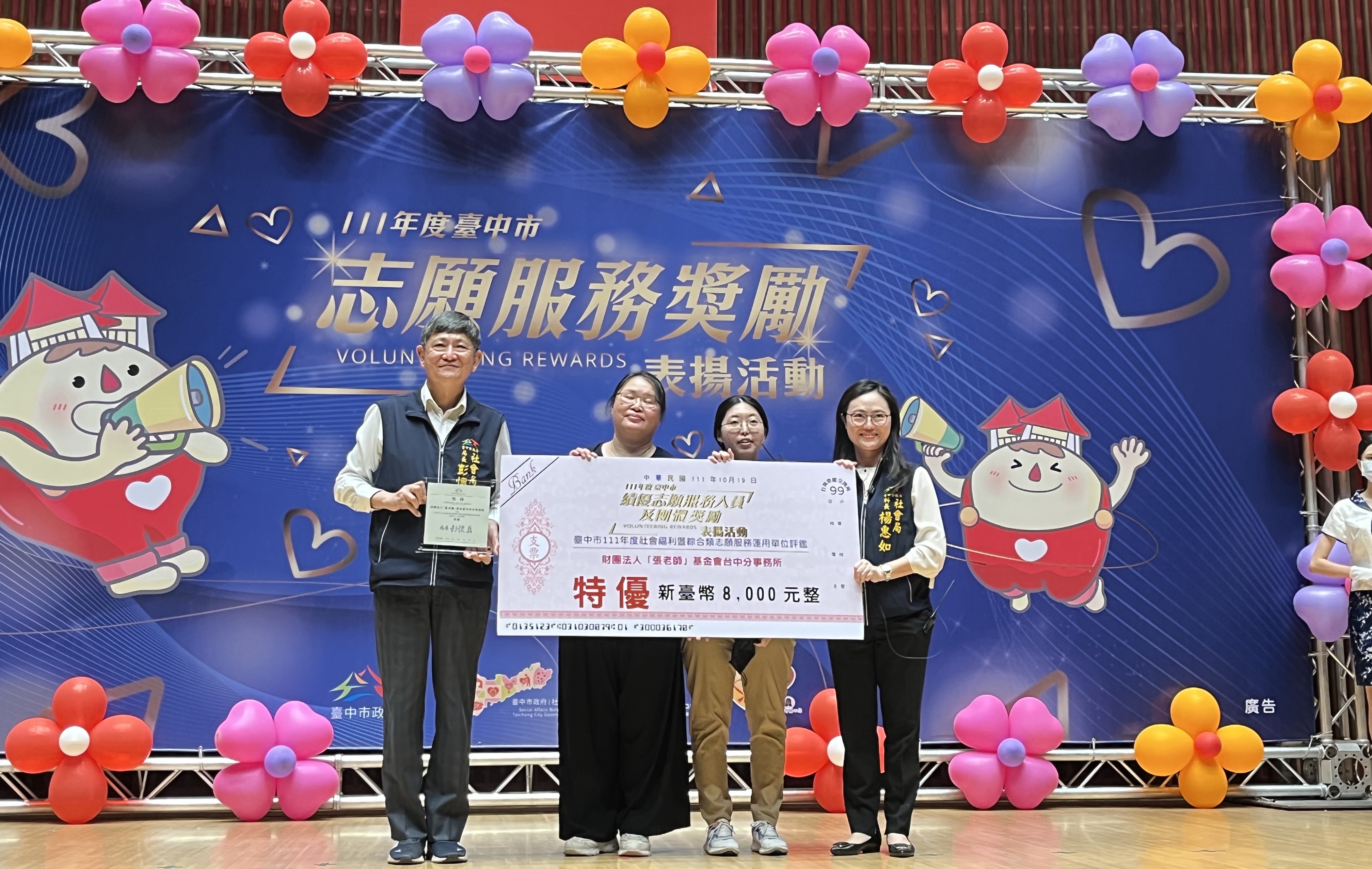社會局說明,台中市志願服務成果有目共睹,期許更多市民投入志願服務,促進社會祥和,不分男女老幼一起展現「社會有愛,溫暖台中」,散播溫暖,傳遞幸福。