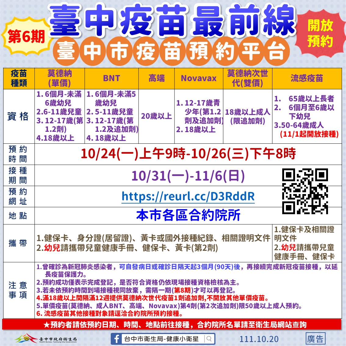 衛生局指出,台中市疫苗預約平台,除提供新冠疫苗預約外,第六期也開放6個月至6足歲及50歲以上民眾預約流感疫苗,簡化疫苗預約作業,此次預約時間為1024日上午9時至26日下午8時止,接種日期為1031日至116日,歡迎符合資格民眾線上預約( https://vaccine.taichung.gov.tw )(10/21*6)* 衛生局
