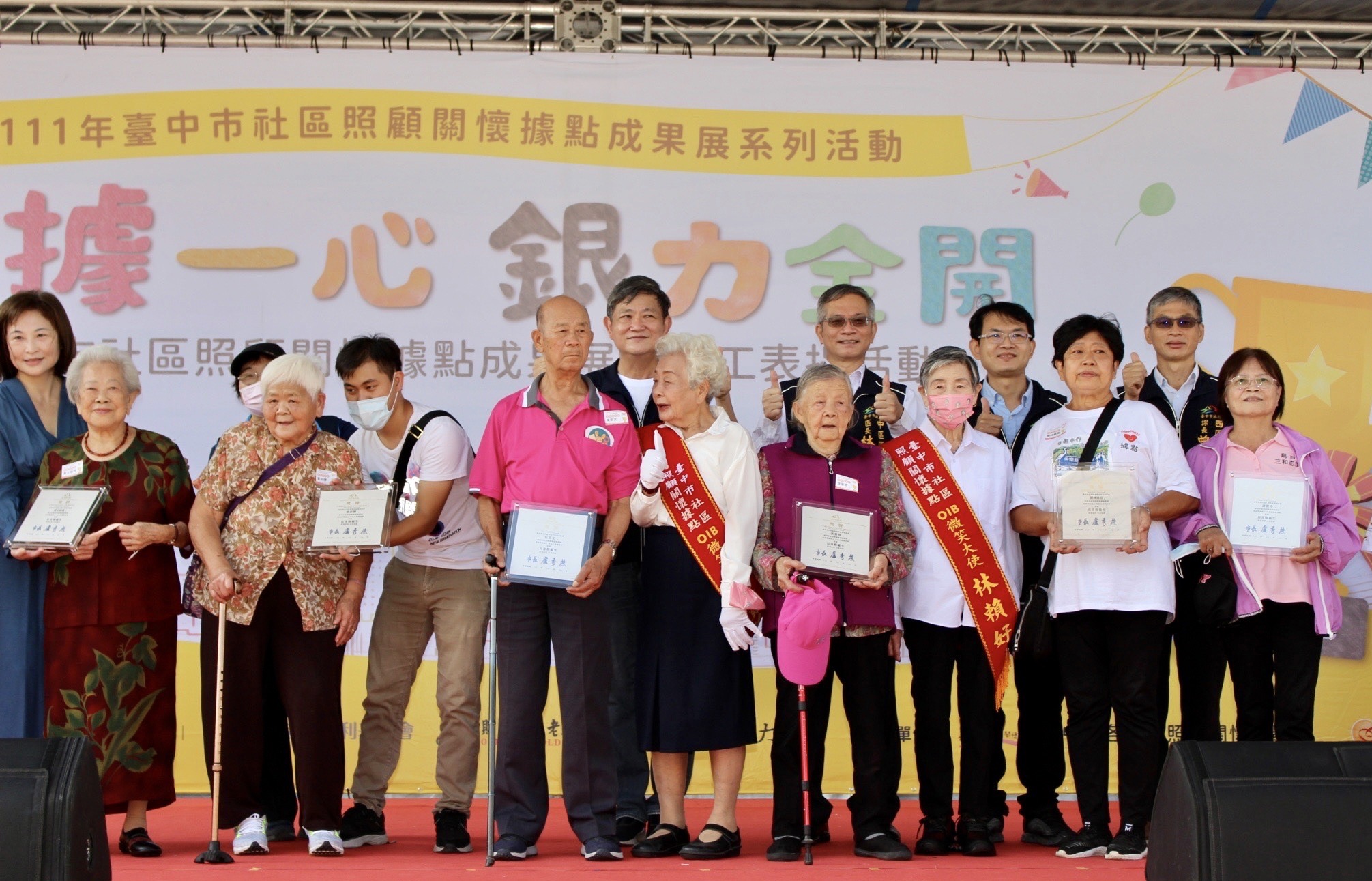 台中市政府社會局今(29)日舉辦「齊據一心 銀力全開」社區照顧關懷據點成果展暨志工表揚活動,共有100個據點,近3,000名長者、志工參與。社會局表示,這是疫情解封後長輩第一次大集合,特別表揚據點優秀的長青模範生、優良志工,包括長青模範生131人、資深志工 113人、特殊貢獻志工52人及模範夫妻志工15組共30人,共計326人獲獎。