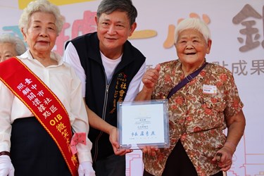 今日由據點票選的「Old is Beautiful」3位微笑大使擔任頒獎大使遞送獎牌,社會局長彭懷真一一頒獎,感謝長輩們發揮以老助老的精神,彰顯高齡志工在據點服務更有意義。彭局長表示,此次共有12位90歲以上的長者獲頒長青模範生獎,今年特別設立模範夫妻志工獎,鼓勵夫妻檔一起響應當志工,因為志工是撐起據點服務的重要基石,歡迎志工全家一起投入服務。