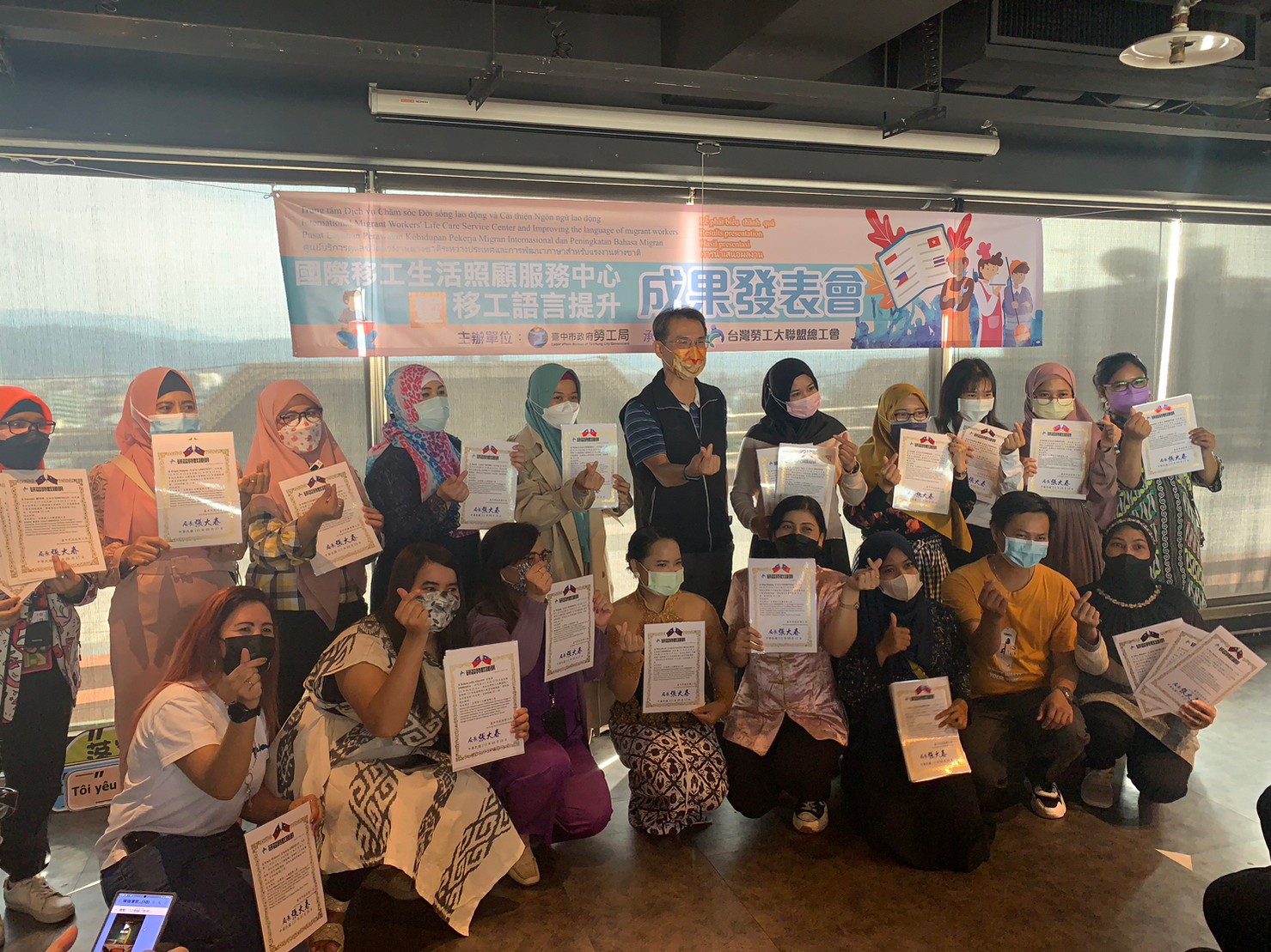 勞工局說明,市府自106年開辦移工中文班至今,已近1300名移工參與,為鼓勵移工學習與溝通,勞工局持續辦理,其中考量移工工作所需,自去年開辦台語課程,頗受雇主與移工好評;今年度更有15名來自印尼的學員於課程後,通過華語證照考試,也於成果發表會現場分享學習成果。