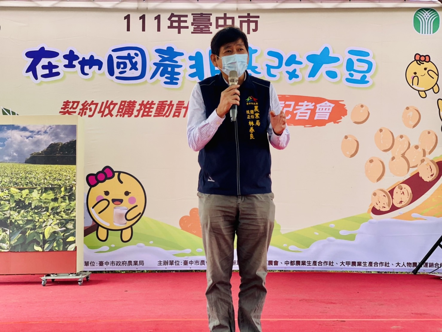 台中市政府農業局為活化農地,配合中央推動轉(契)作及稻作4選3政策,持續輔導以契約收購方式鼓勵農民二期稻作轉作非基因改造大豆,並以源頭管控方式,確保在地生產、安全高品質,今年契作大豆已於11月開始採收,今(24)日於外埔區契作田區舉辦大豆採收記者會,宣告採收期正式開始,契作主體已開發多種大豆產品,歡迎民眾多多選購食用。