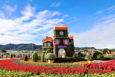 觀旅局提到,展區以「心花開」大門迎賓,數棟充滿綠意的可愛建築為入口意象,主花毯「希望莊園」總高10米,莊園中數幢建築各別住著小精靈們,每日上午10時至下午3時整點展演主花毯秀時,小精靈們將會現身與民眾打招呼,百合花叢中誕生的「花仙子」靈巧可愛,帶著不同個性的「小精靈」在幸福花園裡尋找幸福解方。