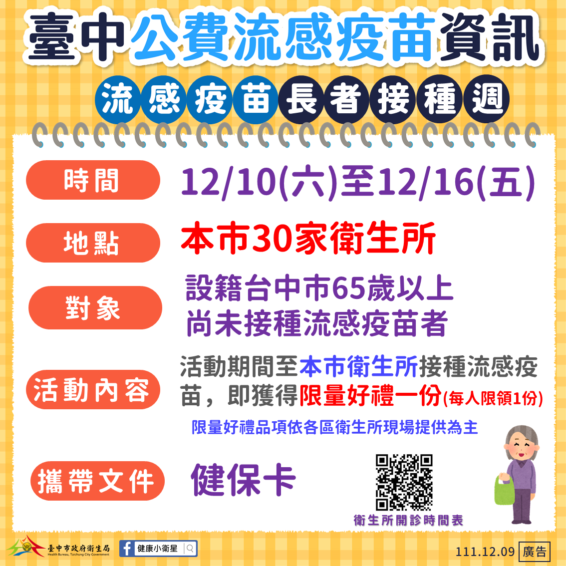 衛生局補充,長者接種週相關資訊歡迎至衛生局網站( https://www.health.taichung.gov.tw/ )查詢,或電洽全市各區衛生所,建議民眾施打前先洽詢衛生所,數量有限、打完為止。(12/8*6)* 衛生局