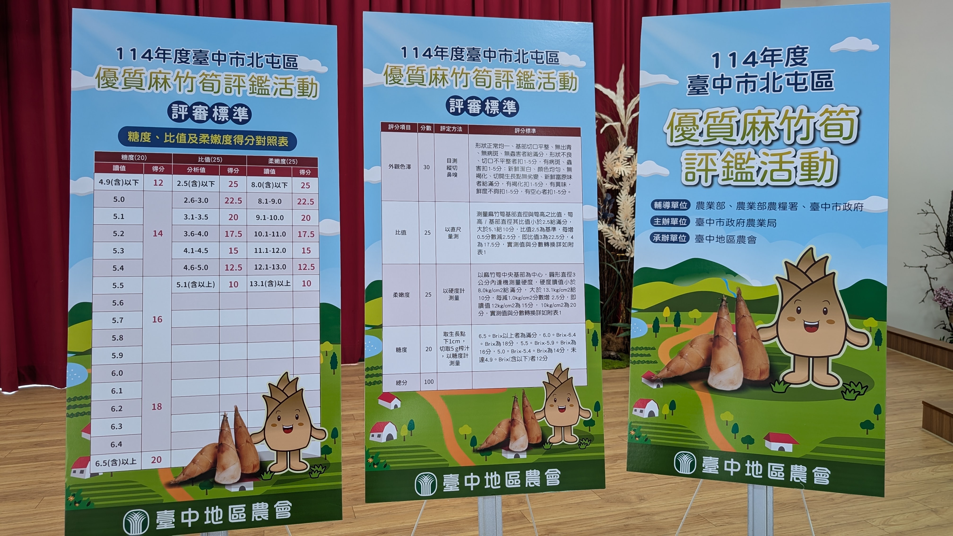 台中市政府農業局為推廣「吃在地、食當季」理念,維護消費者食用安全,並配合臺中北屯區麻竹筍盛產期,特輔導台中地區農會於114年9月26日(星期五)在該會本會5樓會議室舉辦「114年度臺中市北屯區優質麻竹筍評鑑活動」,促進本市麻竹筍農良性競爭、互相交流,進一步提升麻竹筍栽培技術及品質,並推廣臺中在地生產之優質麻竹筍。