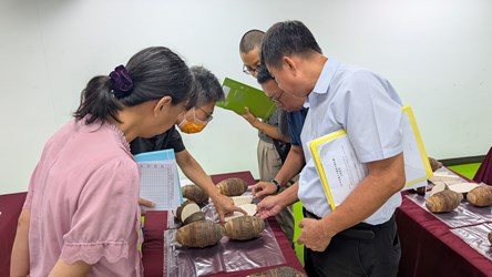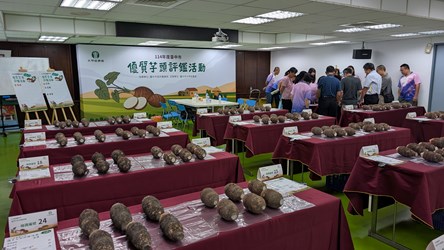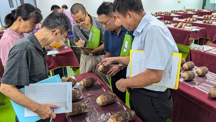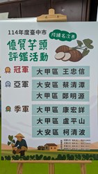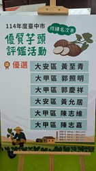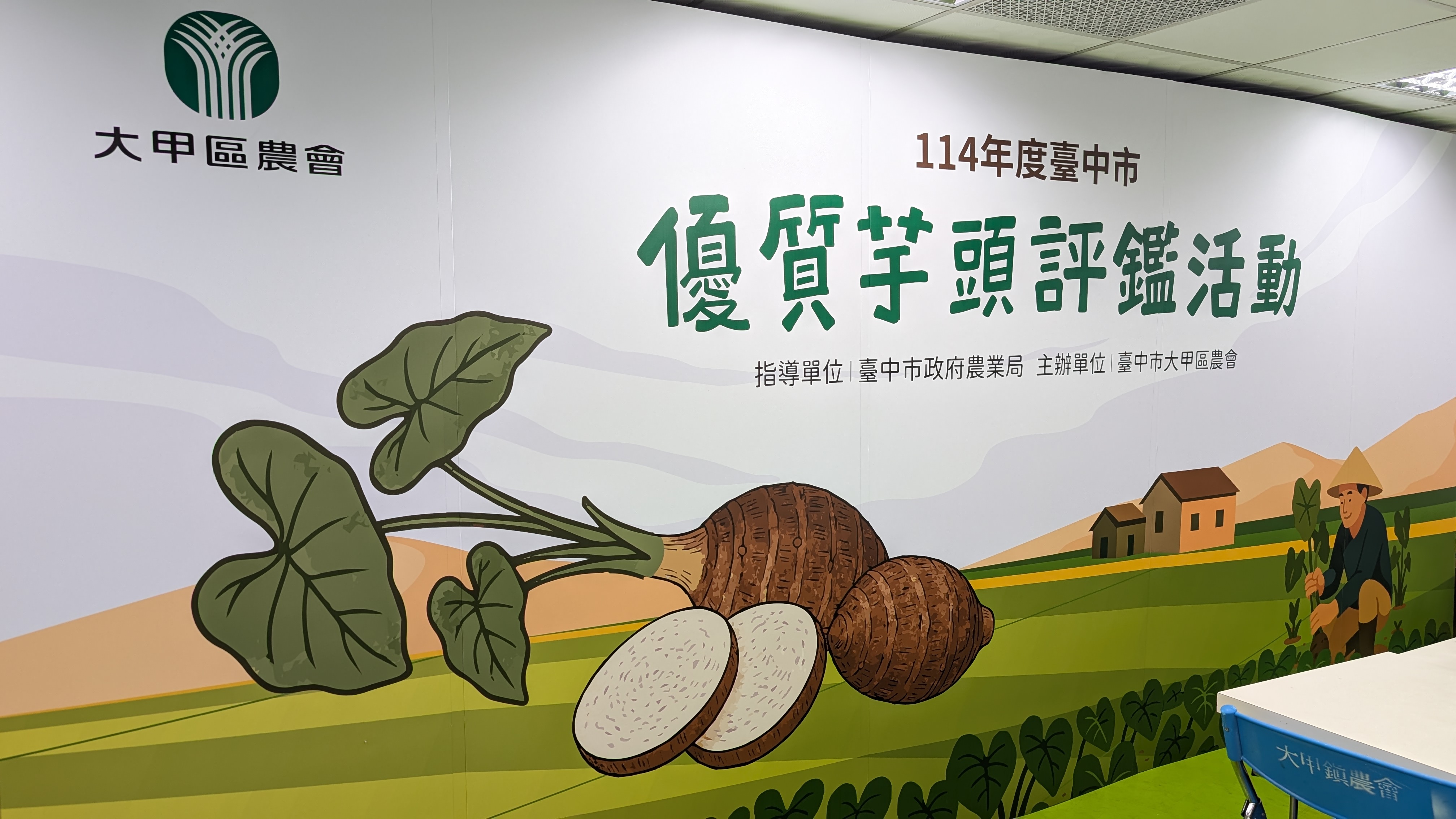 臺中市政府農業局為推廣「吃在地、食當季」理念,讓消費者安心選購在地優質農特產品,輔導本市大甲區農會於114年10月17日(星期五)在該會舉辦「114年度臺中市優質芋頭評鑑活動」,藉由評鑑活動提供本市芋農良性競爭及技術交流平台,提升本市芋頭栽培管理技術與品質,打造臺中市優質芋頭品牌形象,推廣臺中在地農特產品。