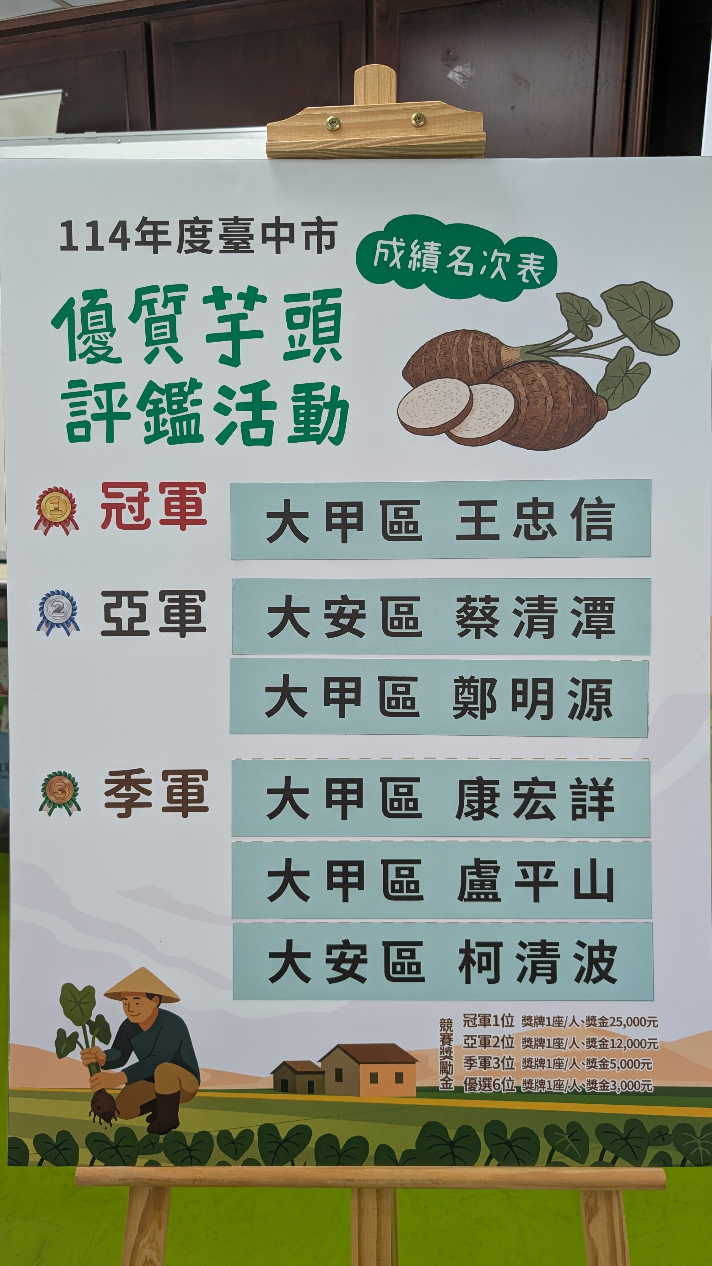 臺中市為全國最大芋頭產區,本年度評鑑共有60組農友參賽,並邀請農業部農業試驗所、農業部臺中區農業改良場、農業部農糧署中區分署、國立中興大學及台中果菜運銷股份有限公司等機關專家擔任評審,依據芋頭生鮮外觀(均重、整齊度、形狀、縱剖面及病蟲害)及熟芋官能品評(香氣、色澤、質地及口感)等項目進行評分,經評審委員仔細審查評分後,由大甲區王忠信勇奪今年度臺中市優質芋頭評鑑冠軍,另大安區蔡清潭及大甲區鄭明源榮獲亞軍,大甲區康宏詳、盧平山及大安區柯清波榮獲季軍,大安區黃至青等6名獲得優選。