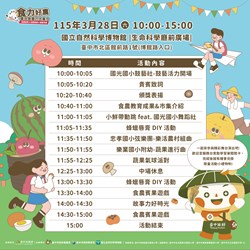 為展現臺中市豐富多元的食農教育成果並持續推動食農教育,臺中市政府農業局、教育局與國立自然科學博物館攜手合作,將於3月28日(星期六)上午10時在科博館生命科學廳前廣場舉辦「115年臺中市食農教育成果展暨校園食農教育嘉年華」。活動以「食力好農.臺中食農力大集合」為主題,規劃食農教育推動成果展示、食農市集、互動體驗、繪本故事分享及教具闖關等多元內容,邀請市民朋友與學童一同參與,認識食物從產地到餐桌的歷程,進一步了解地產地消與永續飲食的重要價值。